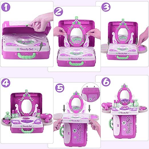 Everything included in this playset can be stored in the foldable vanity case and the suitcase design can help our little princess to carry everywhere easily , so parents never need to worry about pieces being lost or damaged from being left out.