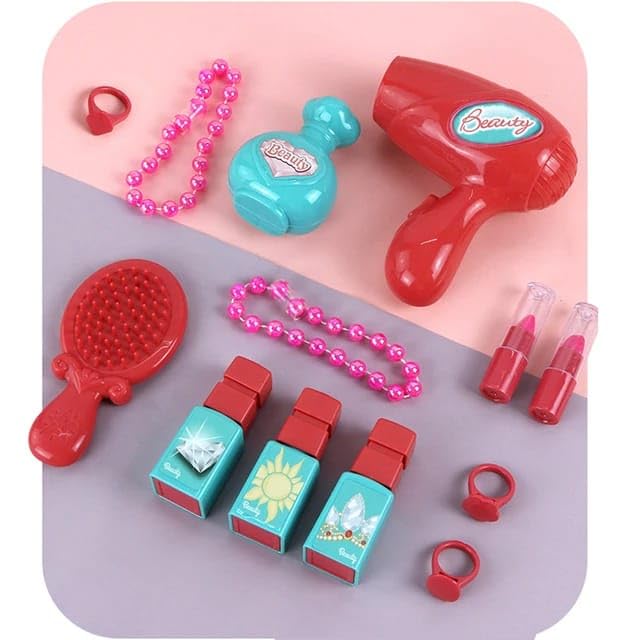 This makeup set include lot of pieces and have fun to let them be a beautiful princess.Everything a real salon would use, from (pretend) make up to hair clips and styling accessories, It includes a Hairdryer, a comb and brush, Hand mirror, Hair clips, and some different makeup accessories.Your little girl can be a hair stylist, or nail artist all with.