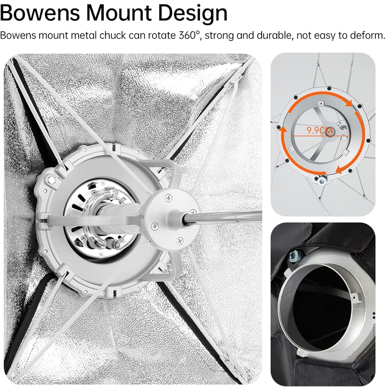 Silvery white umbrella skeleton design, convenient to fold and install, portable, easy to carry. With standard size Bowens mount, this high quality softbox fits right in any studio.