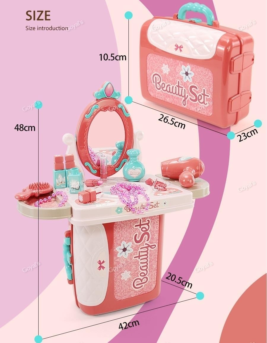 VALUE PRETEND MAKEUP PLAY :- This Girls Beauty Makeup Play Set Include: Durable Backpack Suitcase, Hairpin, Comb, Lipstick, Perfume, Hair Dryer, Mirrors, Stickers, Blush, Nail Polish and More. Hours Of Fun With it.