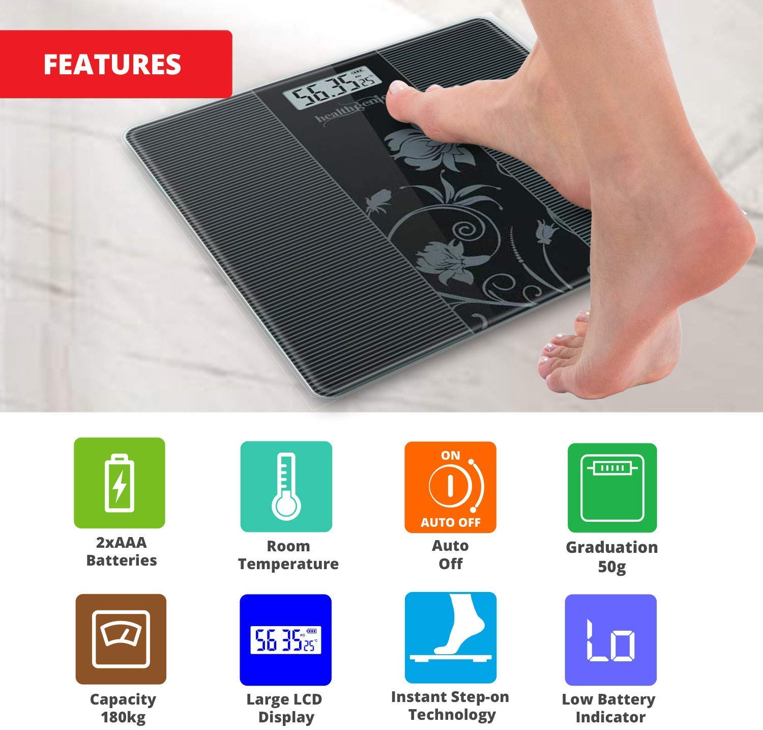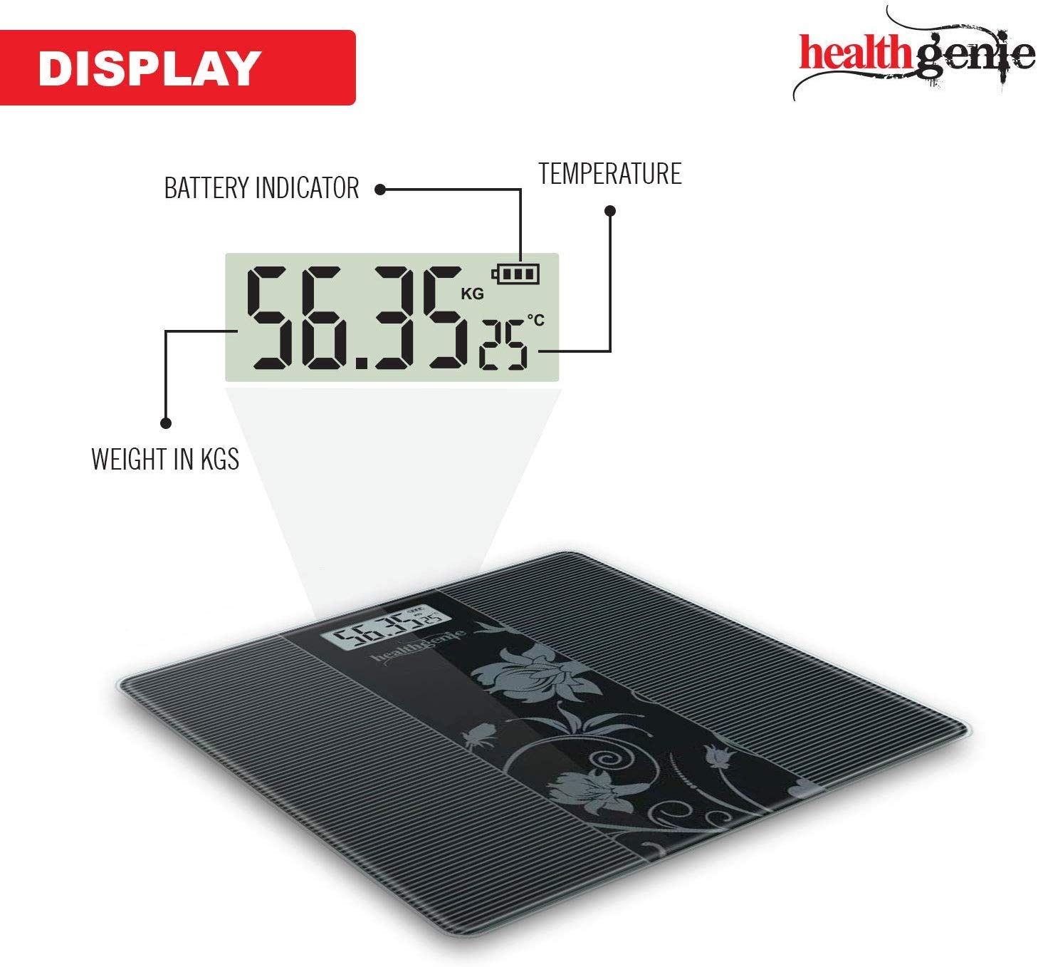 Safety Features – Healthgenie weight scale is made of tempered glass, comes with full foam packaging which protect it from damages. And round corners & anti skid platform for added safety.