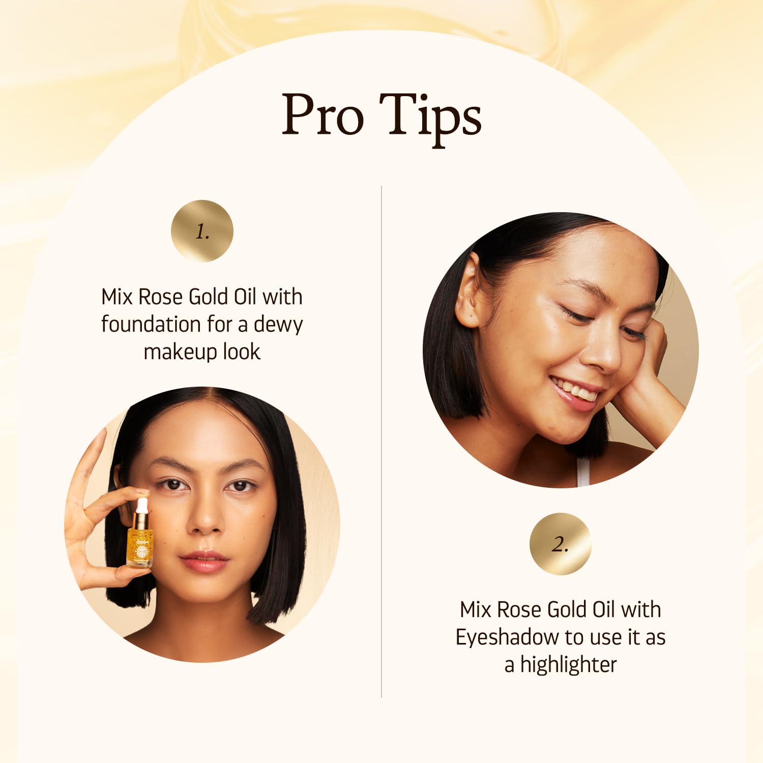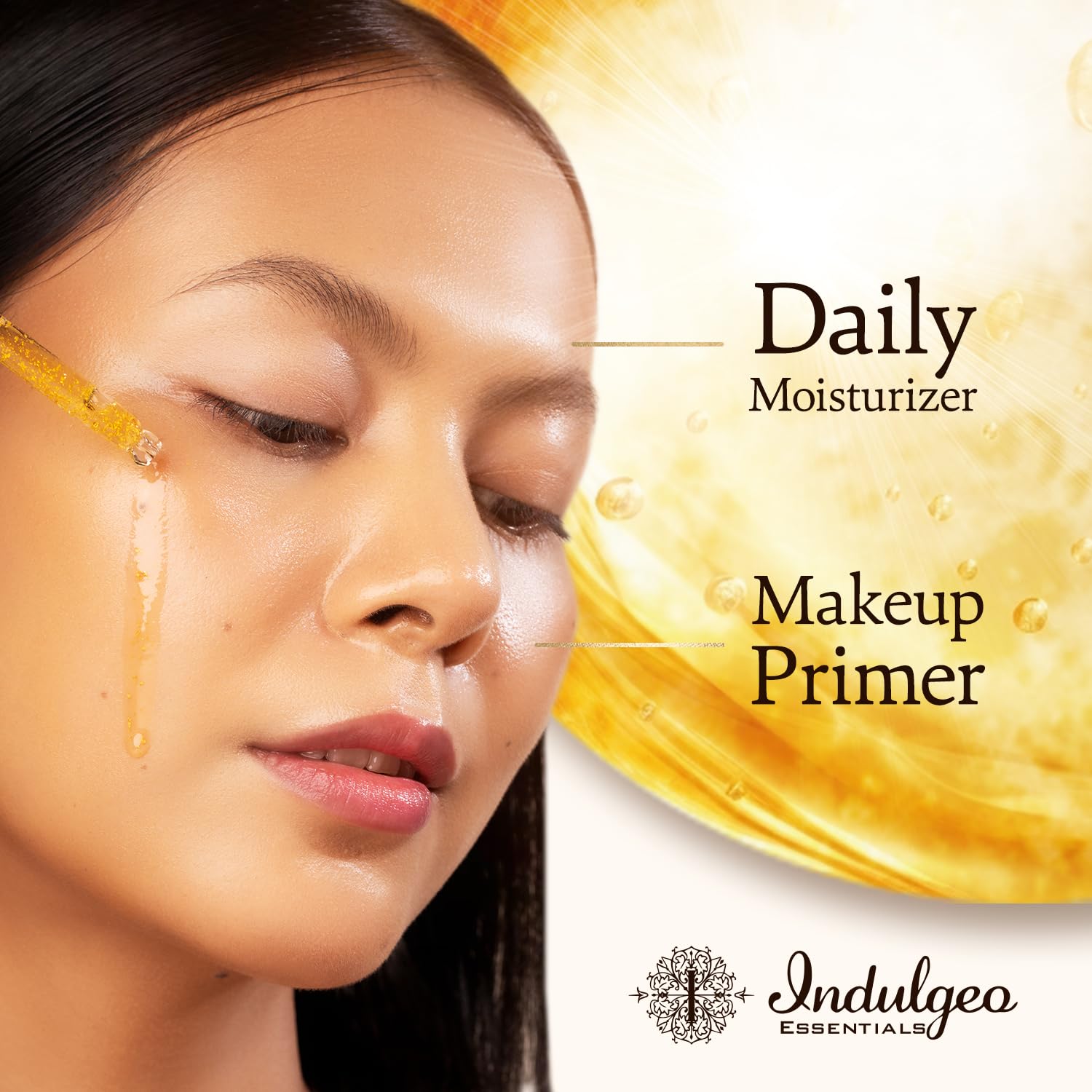 VERSATILE BEAUTY ESSENTIAL : Indulgeo Essentials Rose Gold Oil is more than just a facial oil. Its versatile nature allows it to be seamlessly integrated into your skincare routine. Use it as a standalone moisturizer, mix it with your favorite foundation for a luminous finish, or even apply it as an overnight treatment to wake up to a rejuvenated and glowing complexion. Adapt it to your unique needs and experience the true essence of personalized skincare.