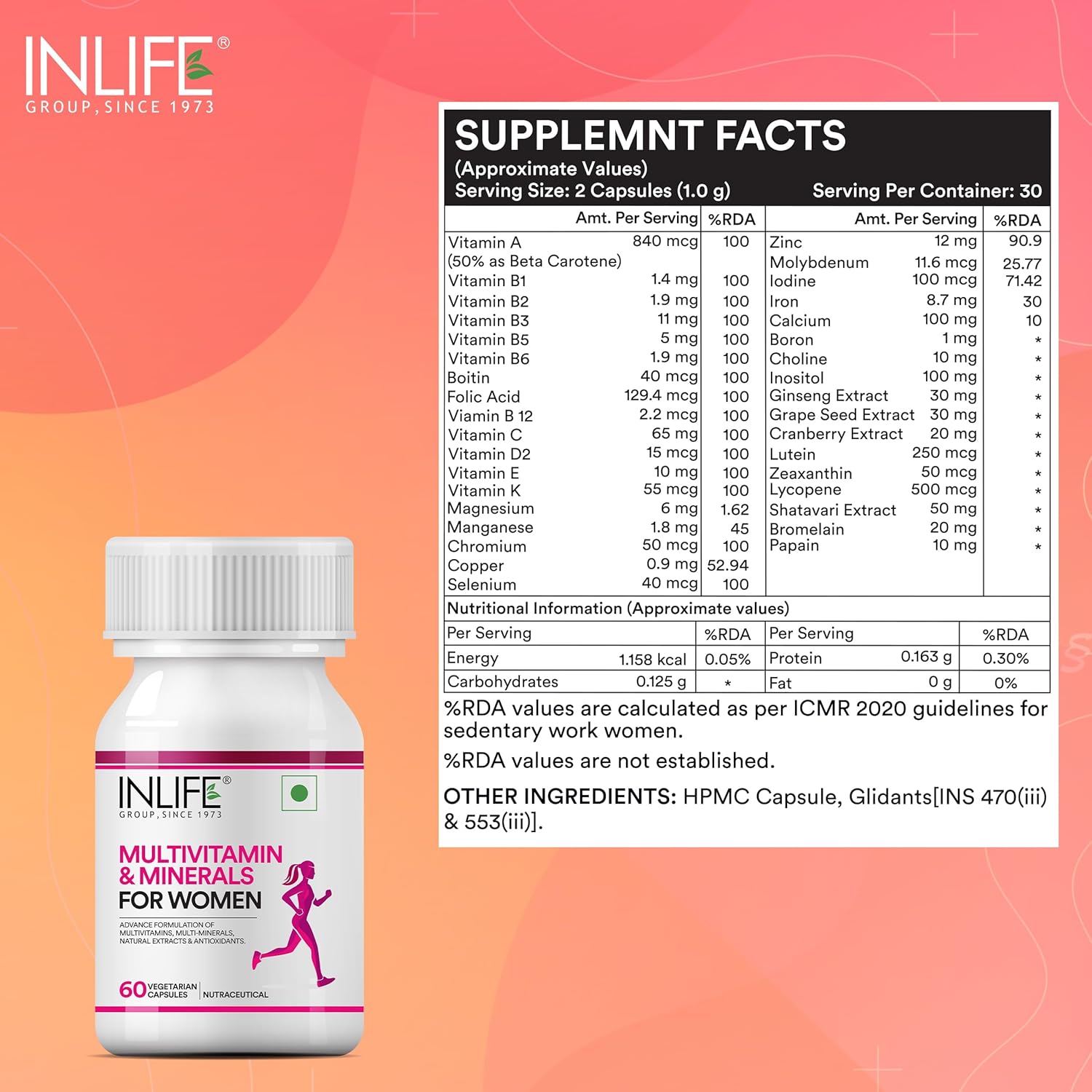 INLIFE Multivitamin Capsules for Women provides the perfect number of vitamins, minerals, antioxidants specially designed for leading concerns of women. It helps to maintain a healthy body.
