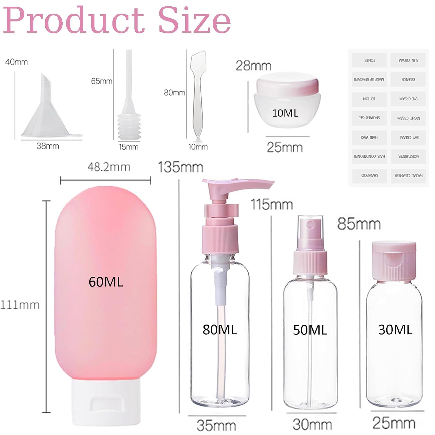 Package Include : 3 x PE travel bottles (60ml/2.1oz.) 1 x Pump bottle (80ml/2.8 oz.) 1 x Spray Bottle (50ml/1.8oz.) 1 x Flip-cap bottle (30ml/1oz.) 2 x Cream jars10ml (10ml/0.35oz.) 1 x Pipette, 1 x Funnel, 1 x Spatula