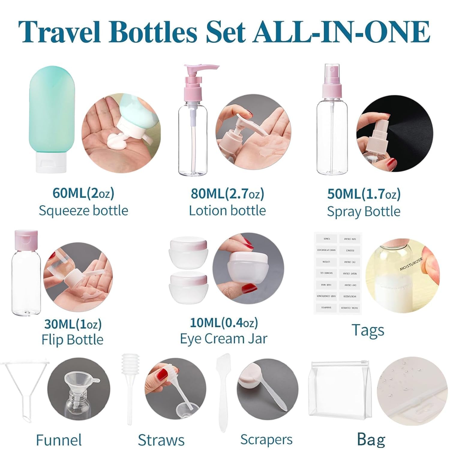 12-Piece Travel Set: Includes 12 refillable, squeezable travel bottles of varying sizes, along with labels for easy identification.