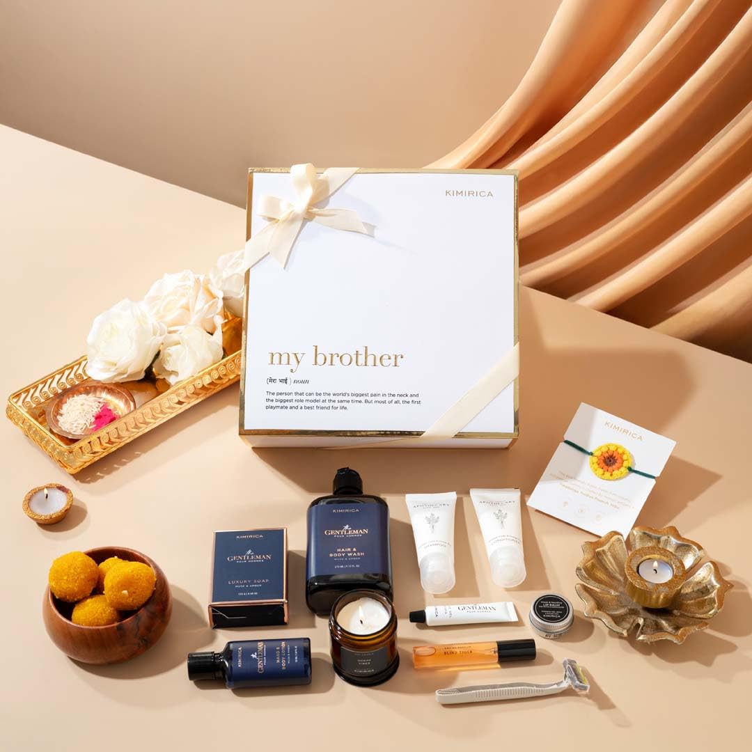 Set Contains-Kimirica Body Scrub 60g |Love Story Body Wash 270ml|Love Story Body Lotion 50ml|Five Elements Shampoo 25ml|Five Elements Conditioner 25ml|Kimirica Red Carpet Perfume 10ml|Kimirica|Lavender Lip Balm 8gm (Tin Jar)|Gulistan Bath Salt 50g |Kimirica Bohemian Summer Candle with Box 60gmPlantable Rakhi