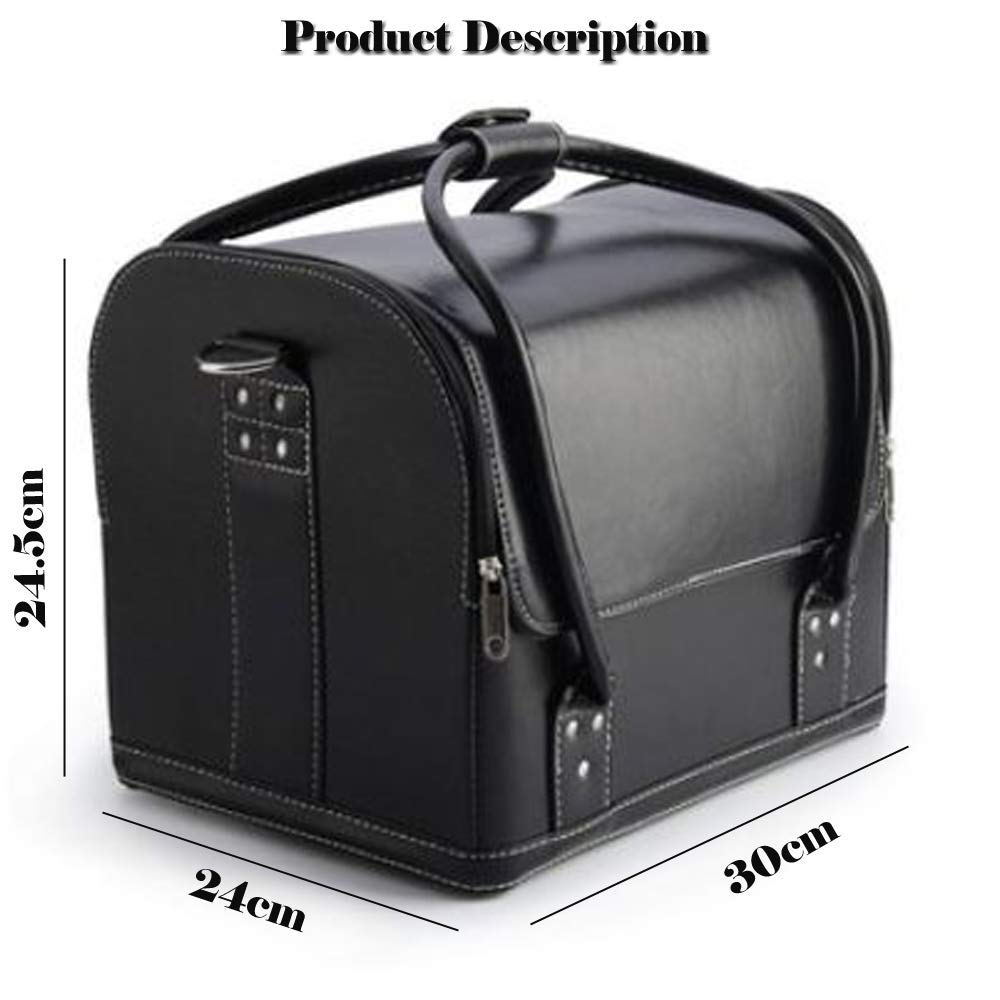 1) Material : PVC Leather, Soft Interior lining with great texture | Color : Black | Size : 24.5*24*30 cm.;2) Design : Large Capacity | ELEGANT | 3 layers within 7 slots provide | more spaces to keep cosmetics organizes.