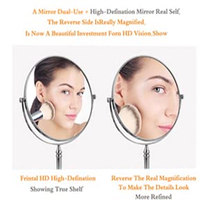 Dual Sided Makeup Mirror with 1x + 5x Magnifying Two-sided 1x/5x Magnification Design 5X magnification is great for detail work such as applying eye makeup or treatment of acne, blackheads and other facial detail. High Quality Makeup Magnifying Mirror Double-sided HD lens, with screw and movable washer, is stronger and more flexible Stainless steel, surface galvanizing process 360 degree rotation, 5x magnification. 360 Degrees Rotation & Space Saving 360 Rotating Function can be freely adjusted and fixed a perfect and comfortable viewing angle as needed. When Not in use, you can fold it and save space. Tabletop Vanity Mirror Made of silver mirror and Plastic metal frame material, it is durable. Elegant shape design, glossy surface, suitable for any occasion. Small size and lightweight, portable to carry. Mirror is 360° rotating, can be placed at any angle you like. Chrome finish. The simple and elegant mirror is suitable for theaters, families, villas, dormitories, lockers, bedrooms, bathrooms, etc. | Its very aesthetic mirror, big mirror with stand, shaving mirror for bathroom , mirror small , make up mirror , face mirror , foldable mirror it is very easy to carry or shift.