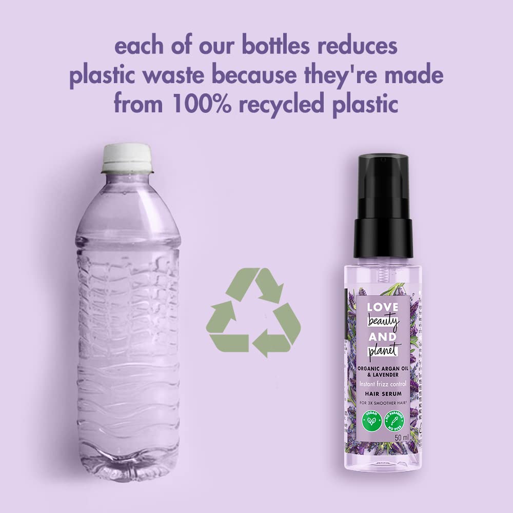 Calm your frizz for hair that’s sleeker & shinier with our Organic Argan Oil & Lavender Hair Serum. Our frizz-control hair serum is made with plant-based moisturizers and infused with 100% organic argan oil. It promises up to 3x^ smoother hair|| up to 99%^ reduced breakage & up to 230°C heat protection. Not just that|| it delicately surrounds your hair in a fragrant cloud of heirloom French lavender|| sourced ethically from the Dromé Provencale region of France. How to use? Pump out a few drops and apply evenly from the mid-lengths to ends on damp hair. For brilliantly beautiful hair|| make sure to use it post washing your locks with our Argan Oil & Lavender shampoo & conditioner Our goal is a carbon footprint so small|| it’s like we weren’t even here. We|| at Love Beauty & Planet have started our journey by loading our products with natural goodness and packing it in bottles made from 100% recycled plastic. Our delicate scents are infused with natural and ethically sourced oils and extracts. All our bottles are made up of 100% recycled plastic waste and are completely recyclable. Our caps and pumps aren’t made from recycled plastics yet|| but we’re working on it. Our products are free from added harsh chemicals like parabens|| dyes and sulfates. Love Beauty & Planet is PETA Certified cruelty-free and vegan. Globally|| Love Beauty & Planet does not test on animals. We are committed to acts of love that make our planet cleaner|| greener and more beautiful.