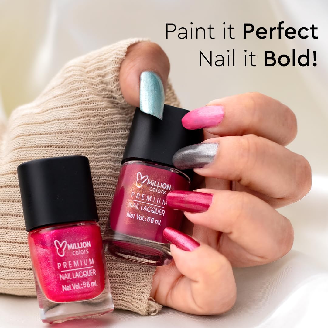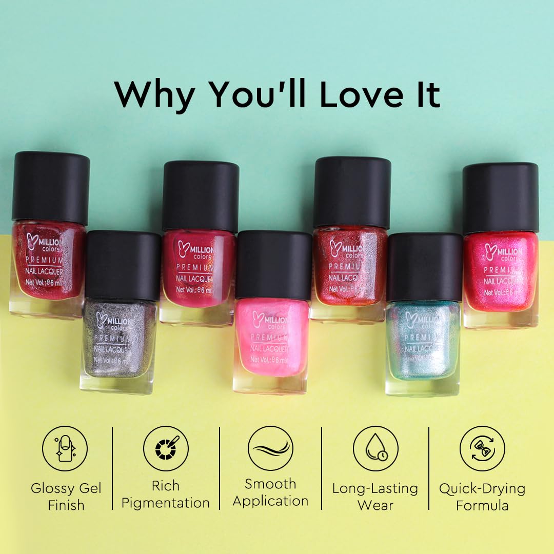 Long-Lasting Nail Polish – Million Colors nail polish combo that seals and locks the color to extend its wear & shine for up to 6 days on your nails.