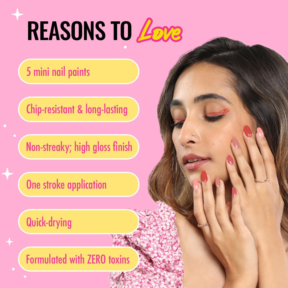 Formula To Die For: These mini nail paints are manufactured with a chip resitant formula, that is toxic free. So you can get streak free, long wearing manicures at home that have a high gloss factor which looks salon-like.