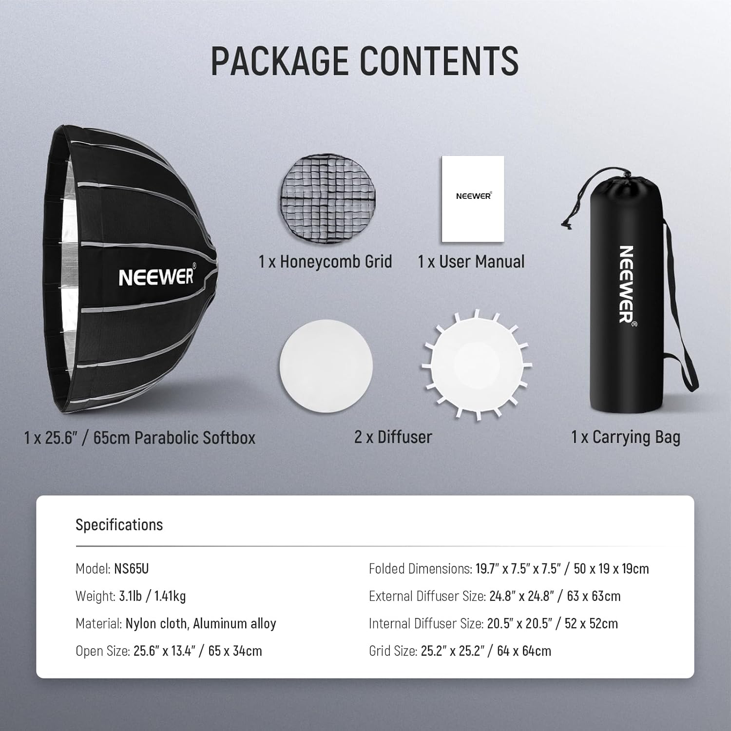 A deep, parabolic softbox with a smooth, even silver internal coating on the thickened nylon cloth creates a broad and diffused output, ideal for portraits, product photography, beauty & fashion shoots, weddings, corporate headshots, and other photography styles. The all metal beauty dish ensures no flash hot spots, equipped with a dual white diffusers for softer light, creating a lighting effect that emphasizes the subject’s features. Two diffusers attached via touch fasteners for easy and quick assembly. Adopts an umbrella like locking system where you can effortlessly open and close the softbox with simply a pull or push then automatically lock it in place. 16 highly resilient ribs give this softbox incomparable durability and an impeccable parabolic shape that can withstand tens of thousands of presses without deformation for years of use. The Bowens mount is compatible with CB200B CB60 CB60B RGB CB60 MS150B MS60B MS60C Vision 4 S101-300WPRO/400W PRO Aputure 120d Godox sl60w and other studio strobe lights and continuous LED video lights with bowens mount. Foldable and merely 3.1lb/1.41kg in weight, the softbox is easy to store and transport inside the included carrying bag. SpecificationsModel: NS65U Material: Nylon cloth, Aluminum alloy Net Weight: 3.1lb/1.41kg Open Size: 25.6″ x 13.4″/65 x 34cm Folded Size: 19.7″ x 7.5″ x 7.5″/ 50 x 19 x 19cm External Diffuser Size: 24.8″ x 24.8″/63 x 63cm Internal Diffuser Size: 20.5″ x 20.5″/52 x 52cm Grid Size: 25.2″ x 25.2″/64 x 64cm Package Contents1 x 25.6″/65cm Parabolic Softbox 1 x Honeycomb Grid 1 x Reflector 2 x White Diffuser 1 x Carrying Bag