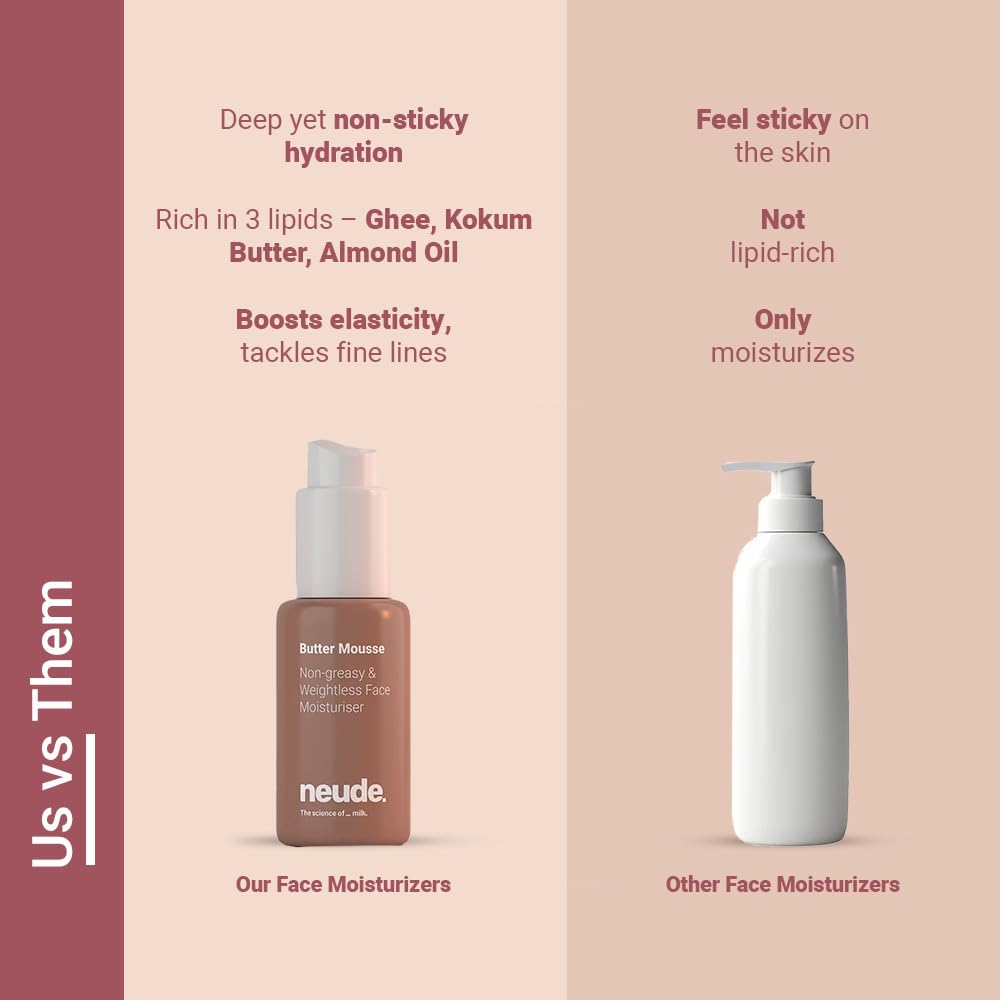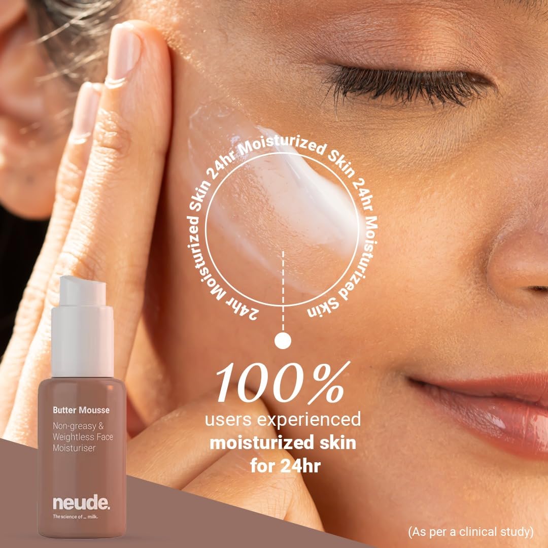 24-hour HYDRATION: As per a clinical study, 100% of users experienced lasting hydration for 24 hours with Butter Mousse. With 3 bioavailable lipids – Molecular Ghee, Kokum Butter & Almond Oil – Neude Butter Mousse Face Moisturizer helps enhance the lipid barrier and lock moisture in for up to 24 hours.