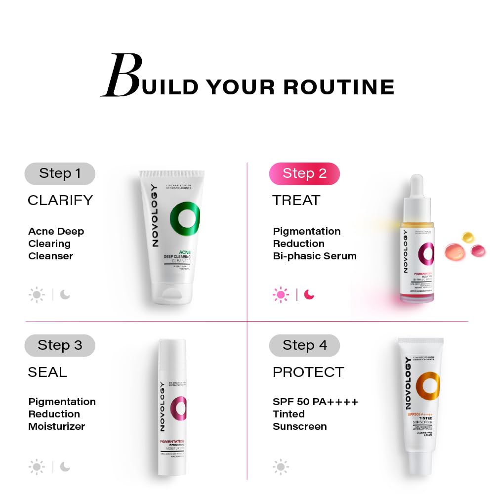 ABOUT THE PRODUCT Novology’s Pigmentation Reduction Bi-Phasic Serum, Co-Created with Dermatologists, is Clinically Proven to Reduce Pigmentation and Dark Spots from Week 4. It is a Light Weight, Quick Absorbing Formula which Gives Instant Brightness. TARGETED SKIN CONCERNS This serum can be used to reduce any type of hyperpigmentation spots – Sun Spots, Acne Spots & Dark Spots. PATENTED HNR3 TECHNOLOGY HNR3 technology works on the root cause of Pigmentation. It works on 3 pathways of pigmentation, unlike some solutions which only work on 1 pathway. Hexylresorcinol: Helps Reduce Melanin Niacinamide: Helps Block Melanin Transfer Pro Retinol: Boosts skin cell turnover This serum features beneficial prebiotic ingredient that supports your skin’s microbiome. HIGHLIGHTS Non-comedogenic Hypoallergenic USAGE RECOMMENDATIONS Shake before use. Massage 3-4 drops on cleansed face and neck until the serum gets absorbed. Use twice daily. SAFETY INFORMATION * For external use only. * Avoid contact with eyes, in case of contact, rinse thoroughly with water. * Stop using it and consult a doctor if rash occurs. * To be used on intact skin and not on cut or abraded skin. * Use of a sunscreen is highly recommended while using this product. * A patch test is recommended.