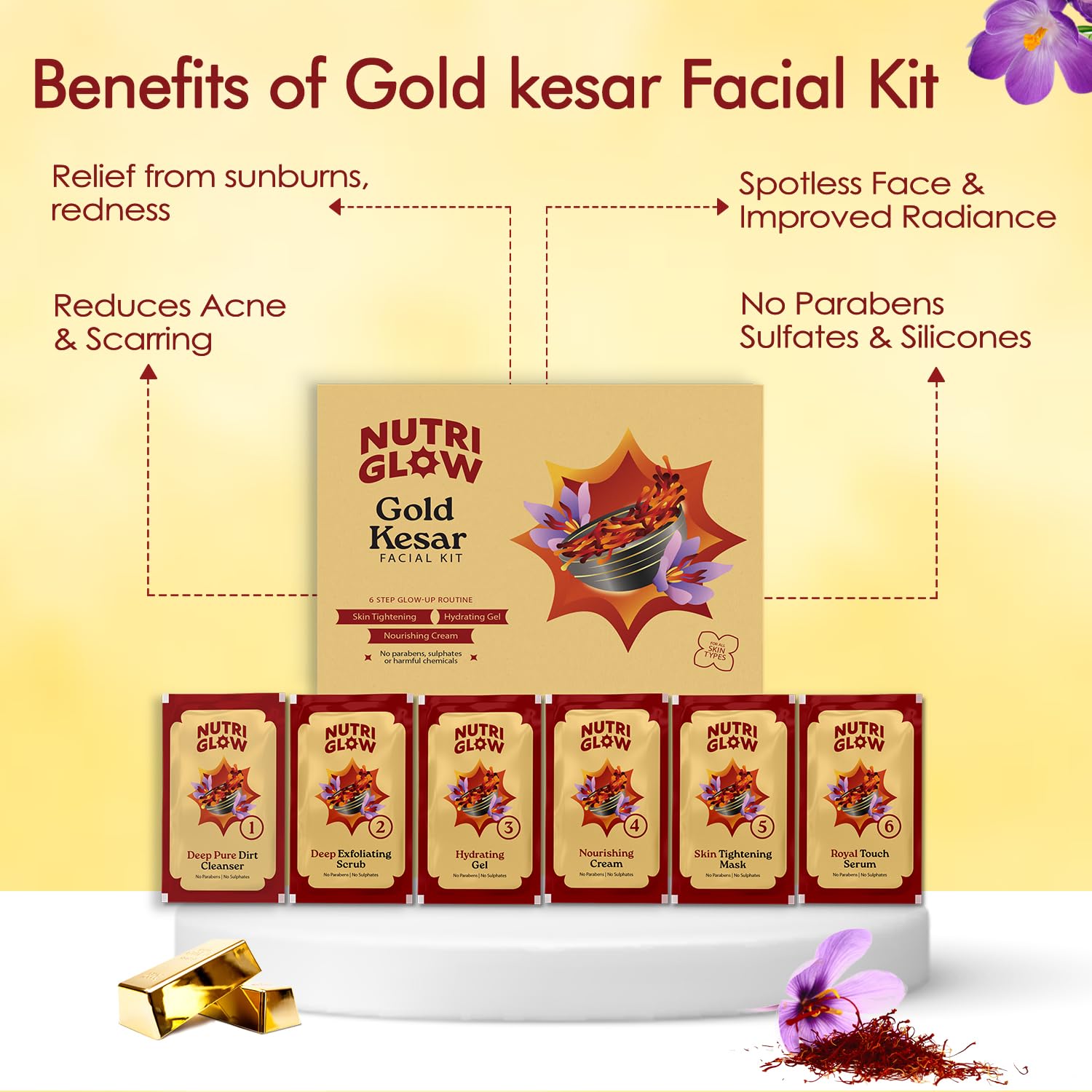 It’s time to reveal your natural glow with this ultimate combo of four facial kits: a wine facial kit, a Papaya facial kit, a Gold Kesar facial kit, and a Diamond radiance facial kit