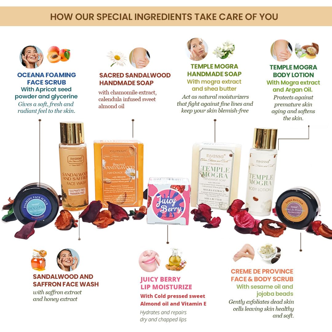 SUPERB GIFTS IDEAS: Nyassa Gift set is ready to go as a gift. Have this on Wedding, Anniversary, Diwali, Holi, Raksha Bandhan, Onam, Gudi Padwa, Navratri, Bhai Dooj, Eid, Mother’s Day, Birthday, Christmas, New Year’s, Thanks Giving, Friendship day, House Warming or a just-because pampering items to make the special person of your life feel relaxed after a long day of work.
