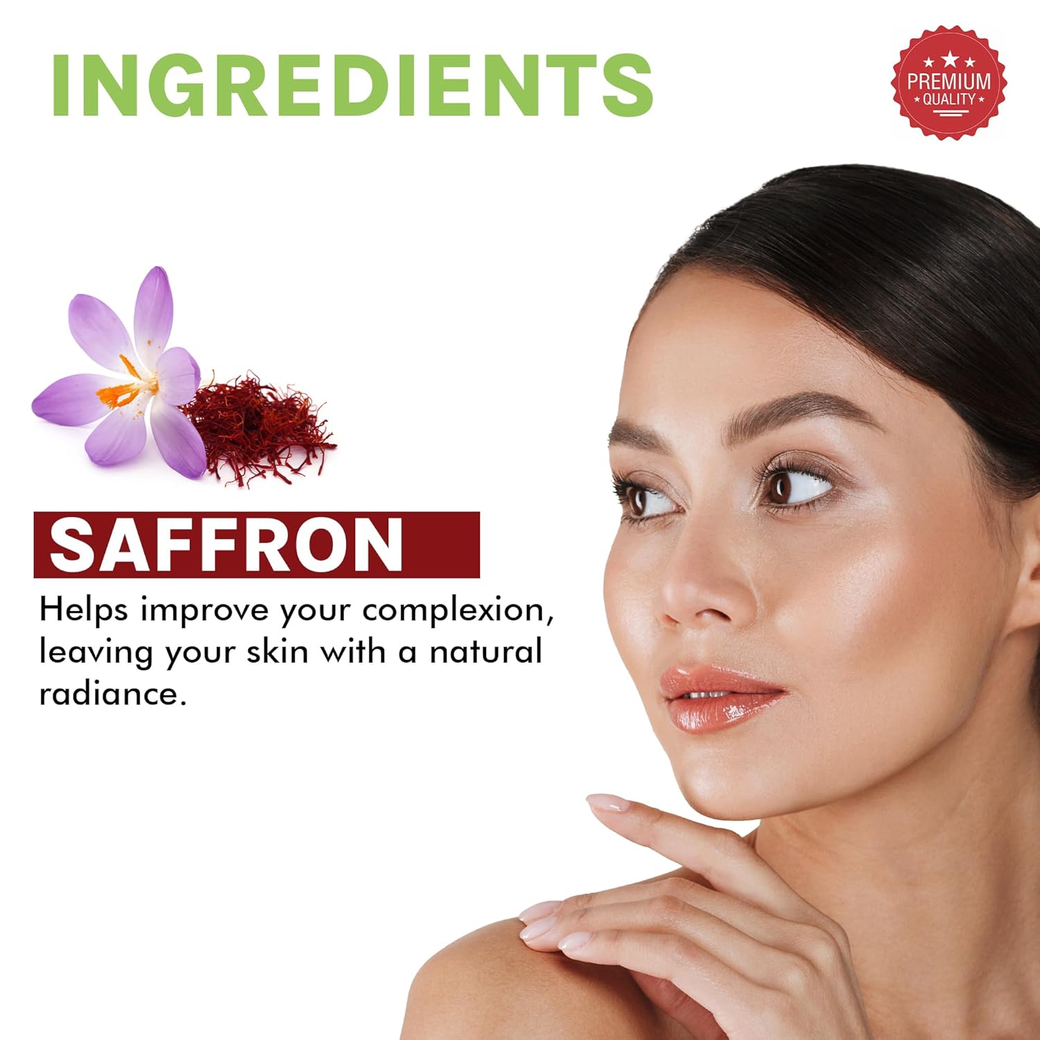 Premium Quality Saffron: Our high-grade saffron tightens pores, restores pH balance, and gives your skin a vibrant, youthful appearance.