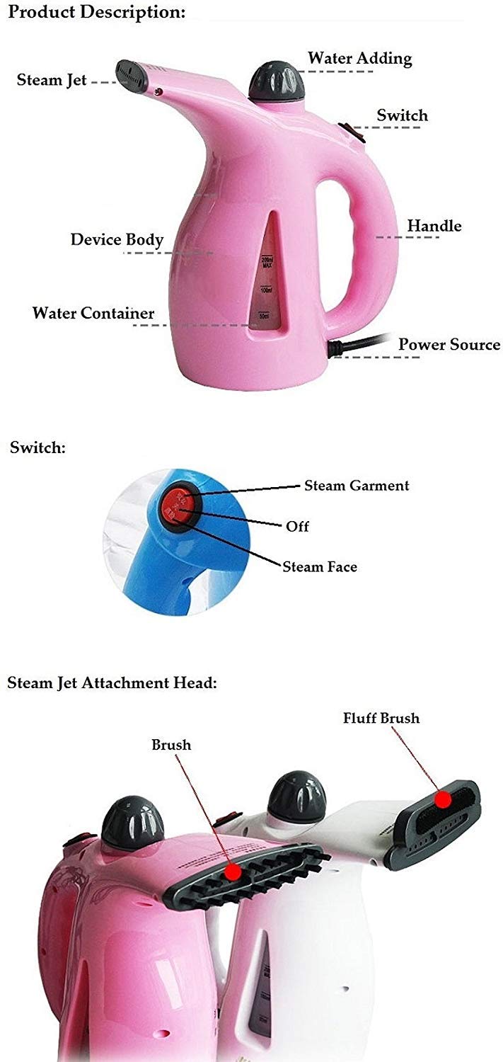 Portable garment steamer facial steamer, handheld steamer, sauna tool, fabric steamer, portable travel steamer, steam humidifier home & office portable garment steamer mini iron household steamer thank you for viewing our colorful handy garment & face steamer & steam humidifier. the garment steamer has a wide scope of application: for home ironing clothes, especially for travel, and the fabric steamer owns the function to steam the face before facial mask. Advantages: colorful handy garment steamer; vertical steaming: easy and efficient lightweight and compact 650gr continuous steam running time 15 minutes removable brush and lint-remover attachments companion for trip and home use illuminated on/off switch tips about operating this fabric steamer product characteristics: 1. Reducing wrinkles, removing dust, sterilizing and disinfecting by high temperature steam. Humidifying, caring face and physiotherapy by soft steam
