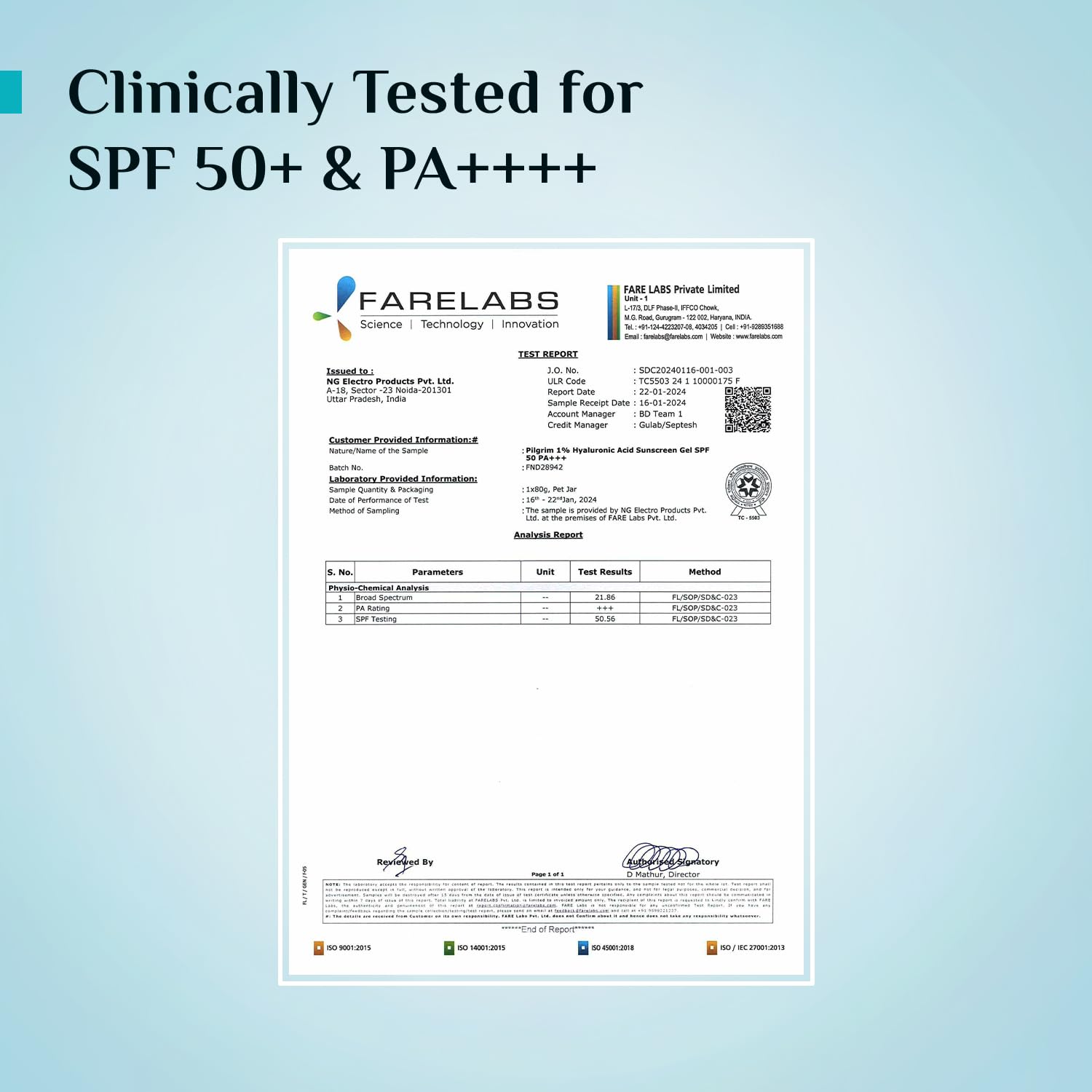 1% Hyaluronic Acid Sunscreen Gel SPF 50 PA+++ is an expert formulation designed to not only protect against sun damage but also enhance your skincare routine by addressing the dryness associated with many sunscreens