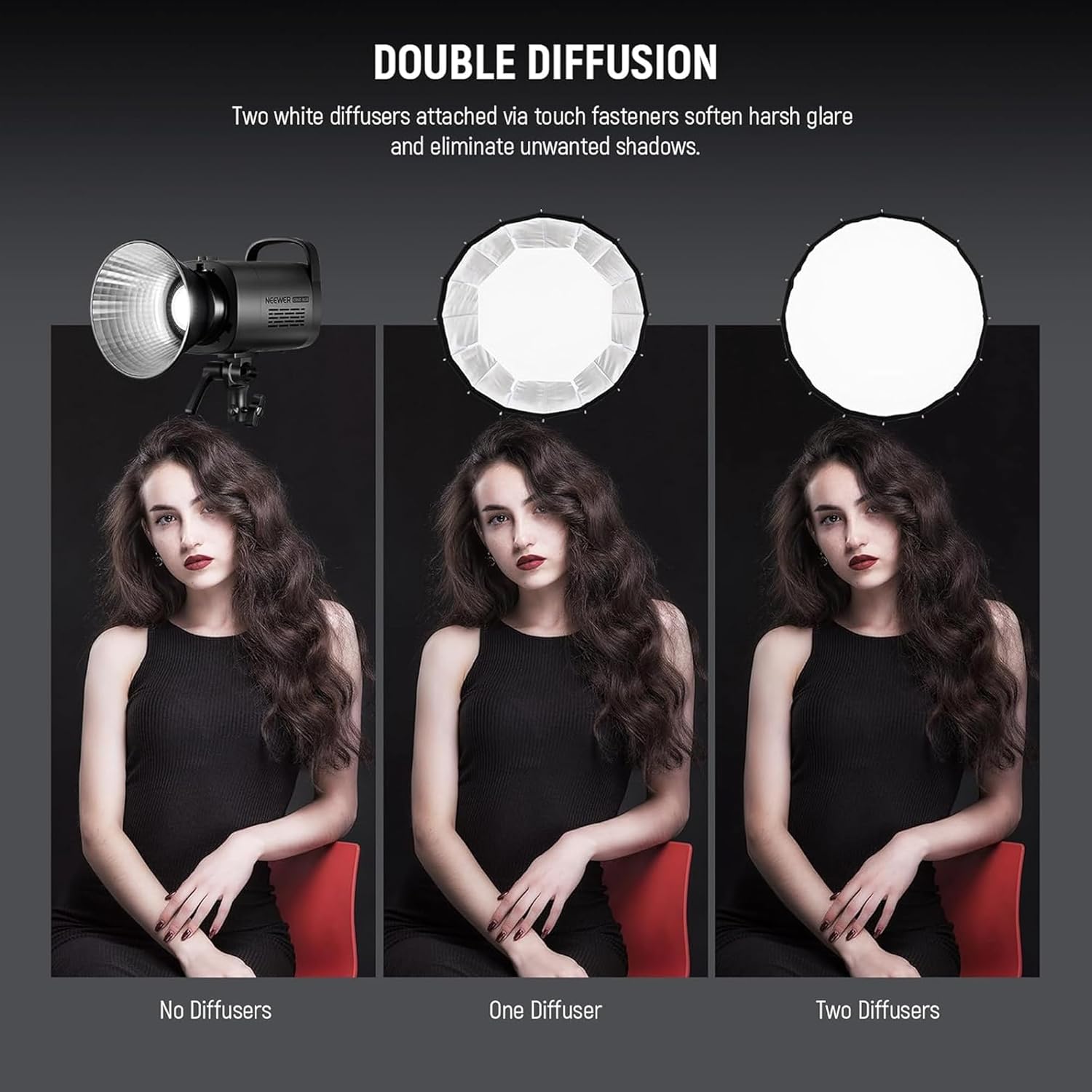 【Professional Parabolic Softbox】 This deep, parabolic softbox features an opening size of 60cm, with a smooth, even silver internal coating on the thickened nylon cloth that broadens, diffuses, and softens light while retaining the original color rendition. Includes two layers of light diffusers and a honeycomb grid for optimal output