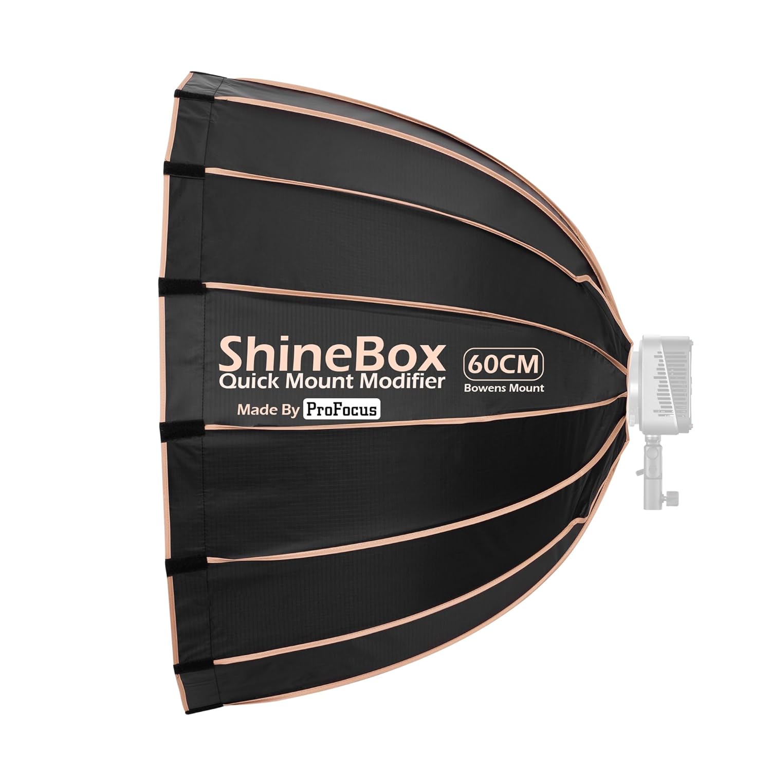 ProFocus ShineBox is a Light Soft Box with Quick Setup Bowens Mount is a professional lighting accessory designed for photographers and videographers to create soft, diffused lighting. It features a Bowens mount, which is a standardized bayonet-style fitting compatible with a wide range of studio lights and modifiers. The quick setup mechanism allows for easy and fast assembly, typically utilizing an umbrella-style or pop-up design. This eliminates the need for complex assembly with rods, making it ideal for on-location shoots or fast-paced studio environments. The softbox is lined with reflective material on the inside to maximize light output while its outer layer diffuses the light, reducing harsh shadows and creating even, flattering illumination. Available in various sizes 60 & 90 cm, it is ideal for portrait, product, or fashion photography where controlled and soft lighting is essential. Some models may include additional layers of diffusion or grids for better light shaping.