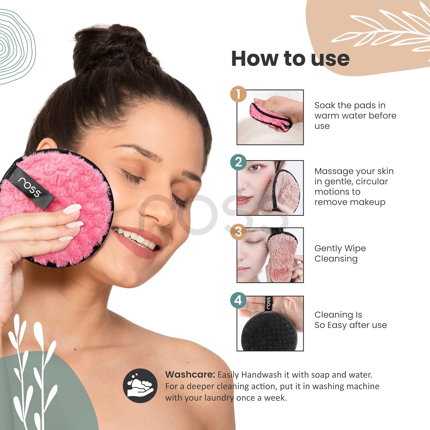Ross cleansing pads are ideal for foundation, heavy eyeshadow, eyeliner, tint, lipstick, and more. You just need a facial cleanser or lukewarm water to wipe off your makeup gently. Ross Cleansing pads remove makeup easily. No need to use chemically treated wipes. The reusable makeup remover pads are an eco-friendly and sustainable alternative to our single-time cotton pads. Our pads are washable making them friends of environment. Reusable up-to 200 wash cycles, each pad replaces upto 500 cosmetics wipes. Ross Cleansing pads suits all skin type be it dry, oily, sensitive etc