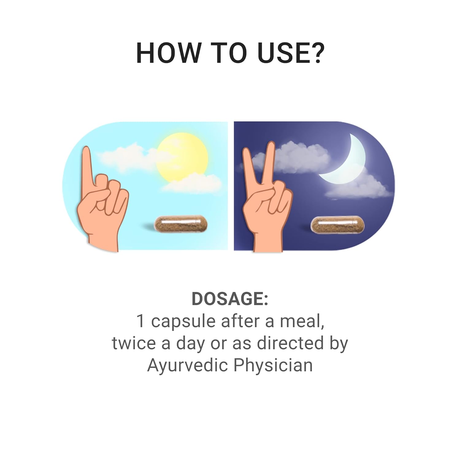 RECOMMENDED DOSAGE: 1 capsule after meal TWICE every day or as directed by Ayurvedic physician.