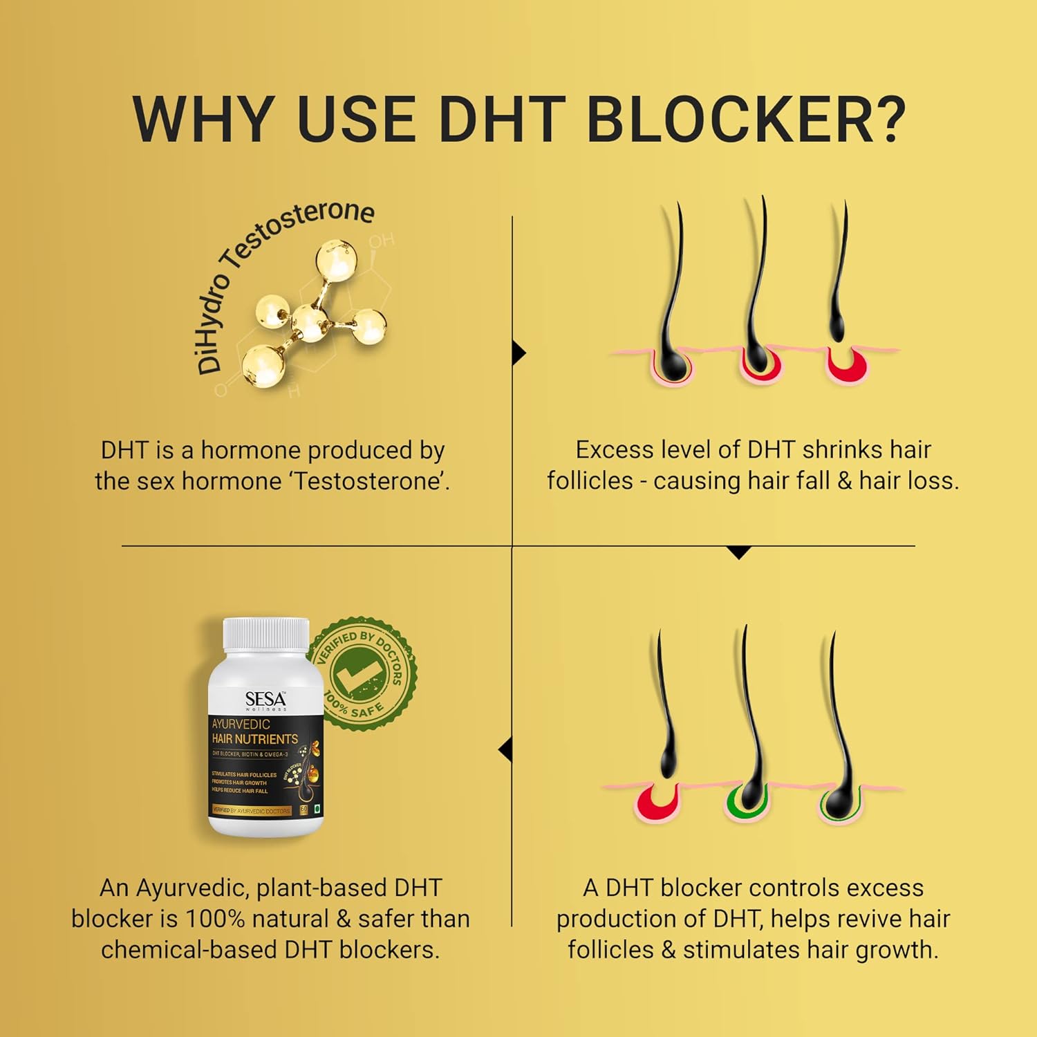 BLOCKS EXCESS DHT PRODUCTION: Sesa Hair Nutrient Capsule is a plant-based DHT blocker that helps block the EXCESS production of DHT, which is known to cause the shrinking of hair follicles leading to hair fall.