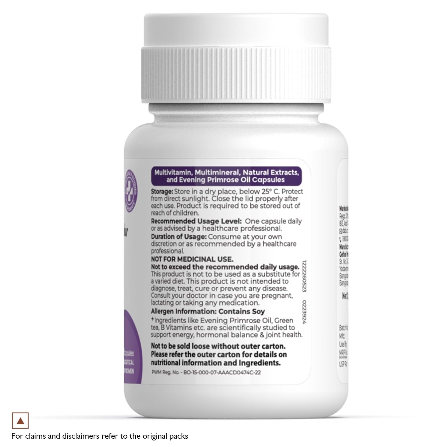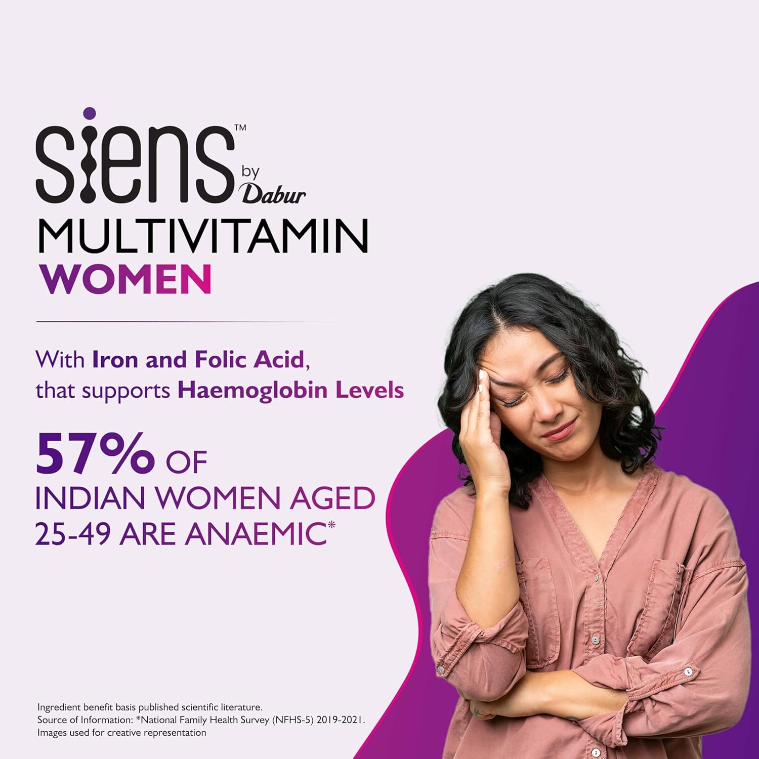 Empower your wellness journey with Siens by Dabur Multivitamin for Women, meticulously designed to support women’s unique health needs. This comprehensive formula includes 32 vital nutrients, scientifically studied multivitamins, natural extracts, and Evening Primrose Oil to support energy level, hormonal balance, joint health, heart health, skin, hair & nail health and supports immunity. Designed for the modern women, these capsules provide the essential nutrients you need to thrive everyday, supporting you from the inside out.