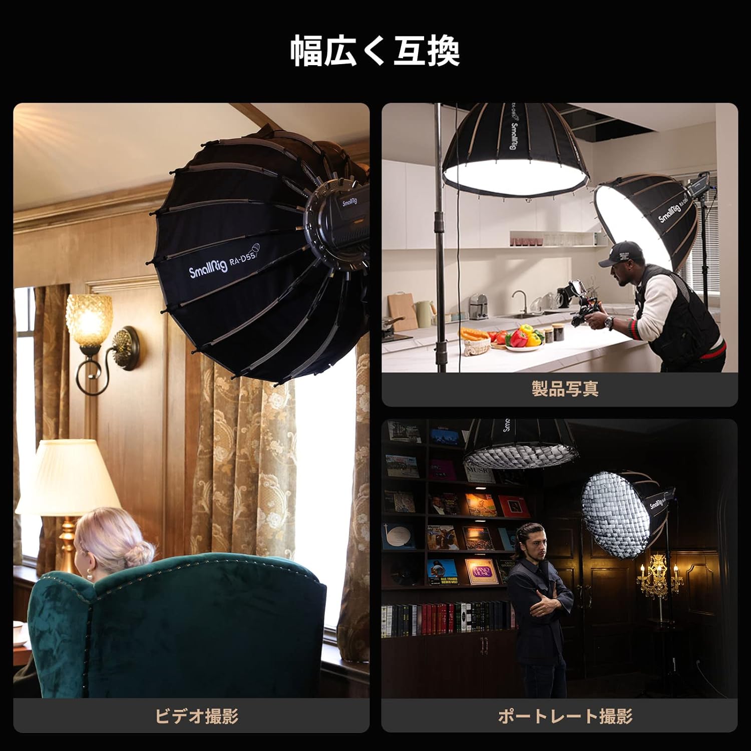SmallRig RA-D55 Parabolic Softbox is a versatile soft light accessory with 55cm diameter. Universal Bowens mount design, makes it compatible with SmallRig RC 120D/RC 120B/RC 220D/RC220B and other Bowens Mount Light of other brands. The new generation of self-developed quick-release design, the diffusion and the frame are combined into one, you can easily install and disassemble the dome in 15 seconds, simplify the use process, bring you the best user experience. RA-D55 also includes a high-quality fabric grid to help focus in your light beam angle to 45 degrees, which will allow you to maximize control of your lighting. Using industrial-grade soft material and highly reflective coating. With two diffusions for a stronger soft effect or higher light transmission to satisfy your different needs.