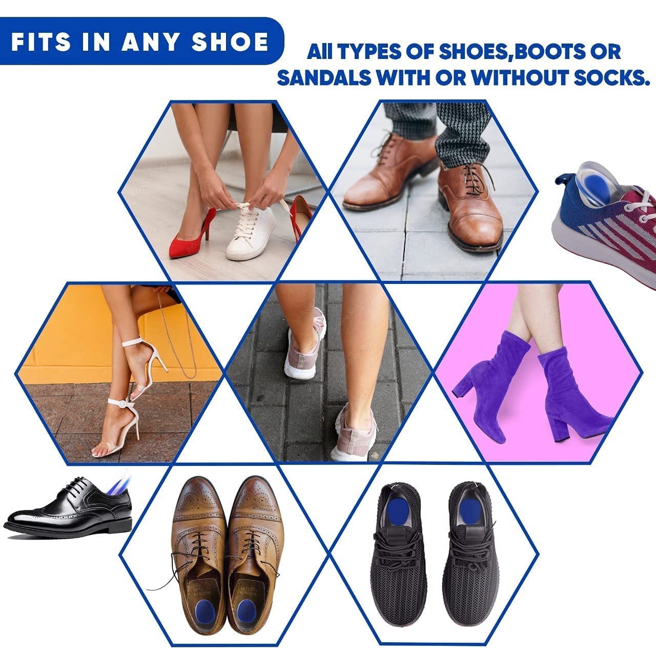 The comfortable gel heel cups can be worn in most shoe styles, including athletic shoes, dress shoes and boots, with or without socks.