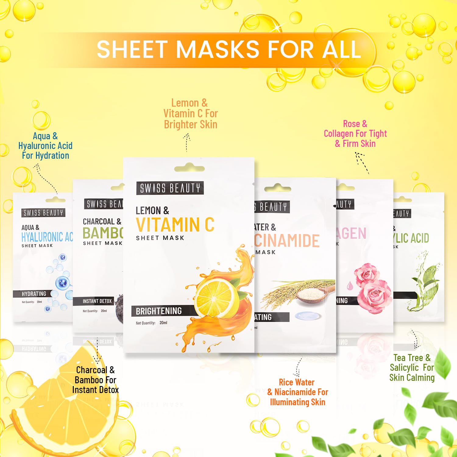 Brightens Skin: Swiss Beauty’s Lemon & Vitamin C Sheet Mask, enriched with Vitamin C, effectively reduces dark spots and brightens the skin for a radiant glow.