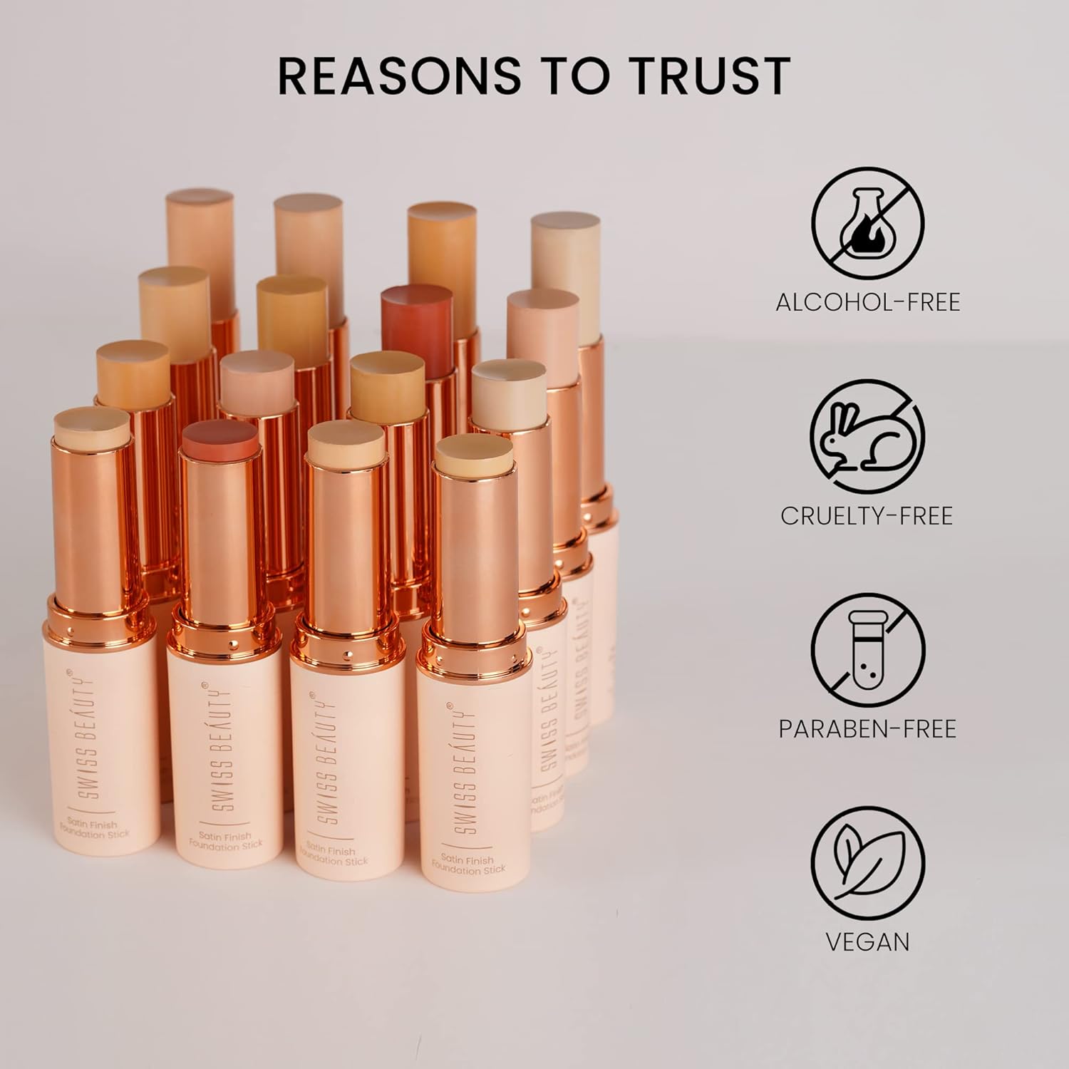 You’ll want to Stick To It! Swiss Beauty Satin Finish Panstick Foundation is your go-to product for a long lasting dewy finish. The creamy texture of this foundation stick glides smoothly on your skin and its flawless coverage hides dark circles, blemishes and dark spots thereby helping to form the perfect base for makeup. Lightweight in nature, the creamy texture melts effortlessly into your skin and blends perfectly. Available in 8 different shades, this panstick foundation is made for all skin tones. Formulated as a long-lasting product, it is 100% vegan and cruelty-free.