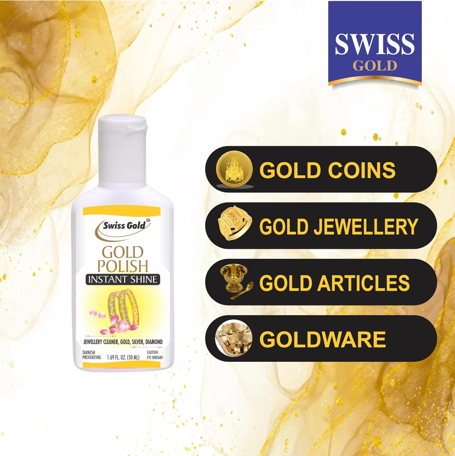 SWISS GOLD Instant Jewellery Shine is a versatile cleaning liquid meticulously crafted for the restoration and enhancement of gold, silver, diamonds, and gemstone-adorned jewelry. Designed for instant results, this powerful formula swiftly eliminates tarnish, dirt, and discoloration, revitalizing the original brilliance of your cherished pieces. Say goodbye to tarnish, dirt, and dullness, and say hello to sparkling, radiant jewellery that’s ready to make a statement. Our jewellery cleaner has been carefully formulated to clean naturally and Platinum Re-Discover the true brilliance that captivated you initially, easy, safe and effective to remove dust, dirt, oils and even bacteria. Non-Toxic and Environmentally Friendly: Our jewelry cleaner is safe for both your jewelry and the environment. It contains no harsh chemicals, acids, or abrasives that can harm your precious pieces. Feel confident knowing you’re making an eco-conscious choice. Easy to use and highly effective, this instant jewellery cleaner is an indispensable companion for those seeking to effortlessly preserve the timeless beauty of their precious adornments.