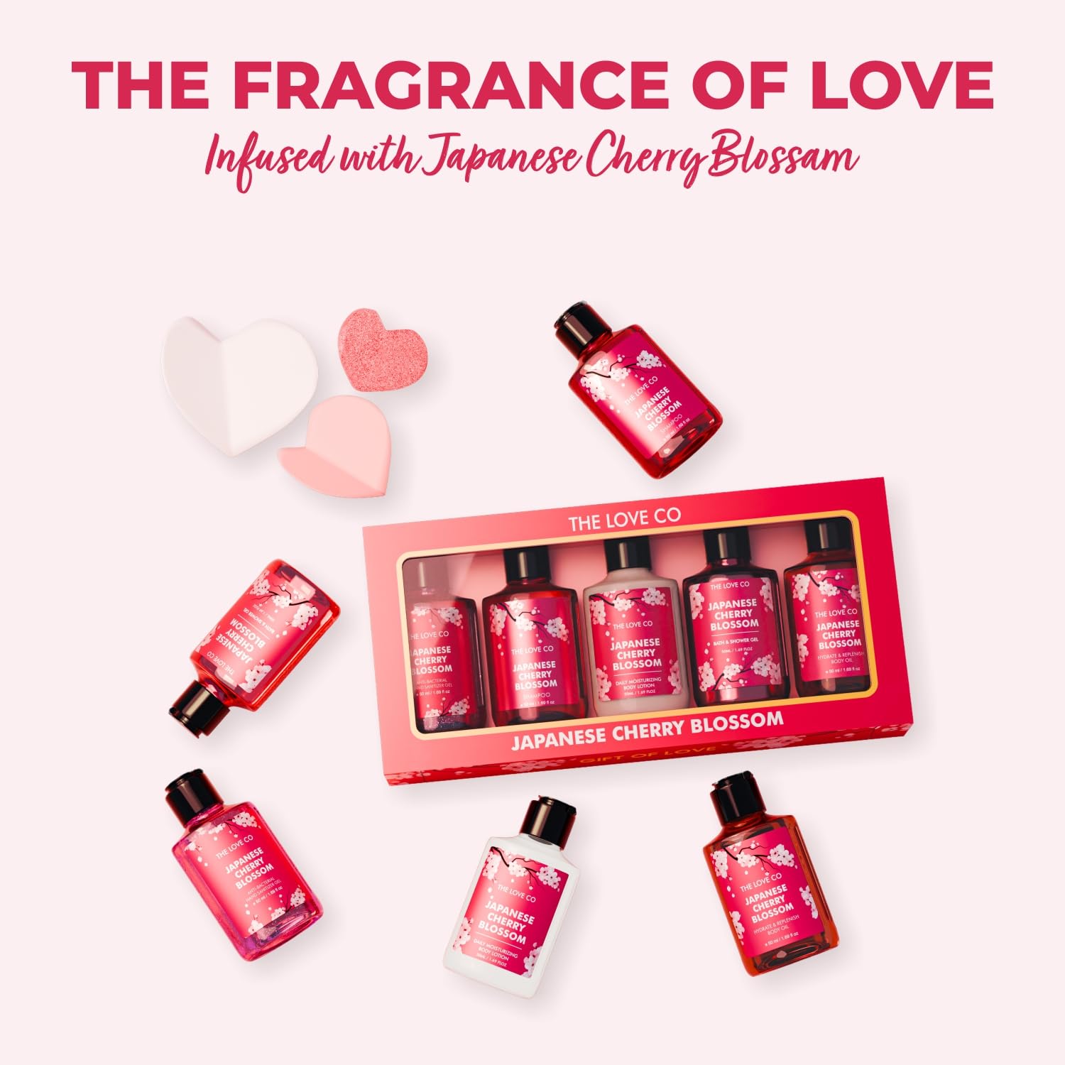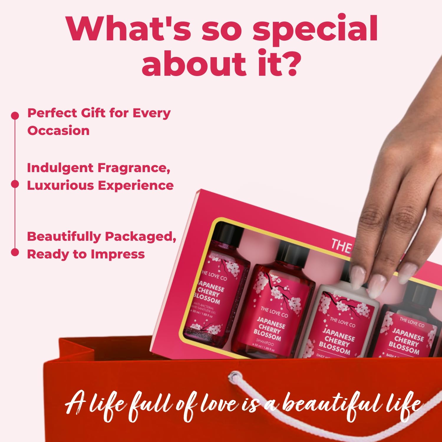 THE LOVE CO. Japanese Cherry Blossom Gift Collection| Indulge in Travel Pack Shower Gel, Body Lotion, Shampoo, Hand Sanitizer & Body Oil | Ideal Birthday & Special Occasion Hamper – Pack of 5