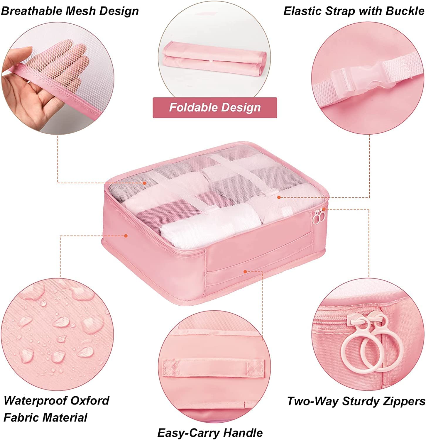Packing Cube Set Details : 7 pcs packing organizers set ( 3 different size clothes storage bags or cubes + 3 laundry pouches which can also be used as 1 bra/underwear bag , 1 cosmetics bag , 1 toiletry bag + 1 bonus drawstring shoe bag). The 3-laundry pouch can be used for your used clothes while the compression garment bag can be used for footwears.