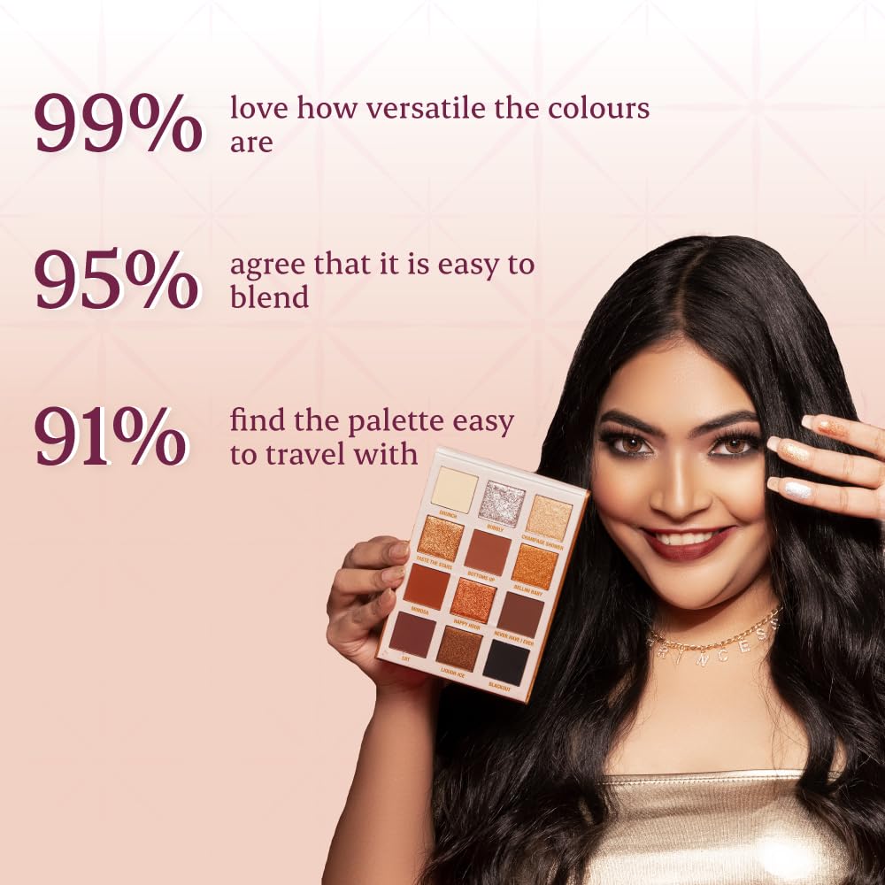 Elevate your eye makeup game with the versatile Typsy Beauty Pop Fizz Clink Champagne Eyeshadow Palette. This must-have palette features 12 perfectly paired shades in a range of wearable matte, shimmer, and foil finishes. The Pop Fizz Clink Champagne Eyeshadow Palette is designed for both beginners and professional makeup artists. Formulated in Italy, our eyeshadow palette delivers highly pigmented shades that provide one-swipe payoff for effortless application. Each shade is carefully curated to complement Indian skin tones, ensuring that you can achieve the perfect look every time. From natural and subtle to bold and dramatic, this palette has you covered for any occasion. The lightweight and travel-friendly packaging makes it easy to take this palette with you wherever you go. Whether you’re traveling or simply on-the-go, you’ll always have access to your favorite shades and a convenient mirror for touch-ups. The shades provide instant color payoff, whether you prefer to apply them with a brush or your fingers. The texture is easy to blend, ensuring seamless transitions between shades and effortless blending for a flawless finish. With 12 exquisite shades inspired by the effervescent charm of champagne, this meticulously crafted palette features a versatile range of shades, from sparkling golds and soft neutrals to shimmering bronzes. 100% vegan, cruelty-free & paraben-free. Dermatologically Tested.