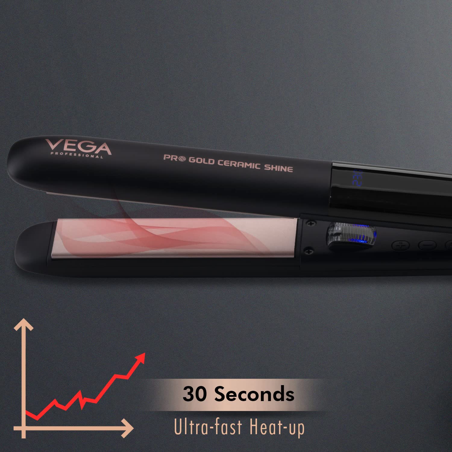 VEGA Professional Pro Gold Ceramic Shine Hair Straightener is designed for use by master stylists and hairstyling enthusiasts to create desired looks. With 26 mm tourmaline-infused gold ceramic floating plates, the professional hair straightener provides added durability and an even smoother glide. Its negative ion technology locks hair cuticles and removes frizz and static for silky and shiny hair. Not only that, its auto-adjustable 3D floating plate guarantees the perfect alignment without any gap. The hair straightener for salon finish sleek straight hair features a 60-minute automatic safety cut-off with adjustable pre-set temperature settings between 150°C-230°C and LED for precision heat. Its quick heat-up feature in 30 seconds with advanced heat recovery technology offers efficient hair straightening at home and salon while its 360° Swivel 9 ft power cord rotates easily to prevent twisting and tangling while straightening hair or clients or oneself.