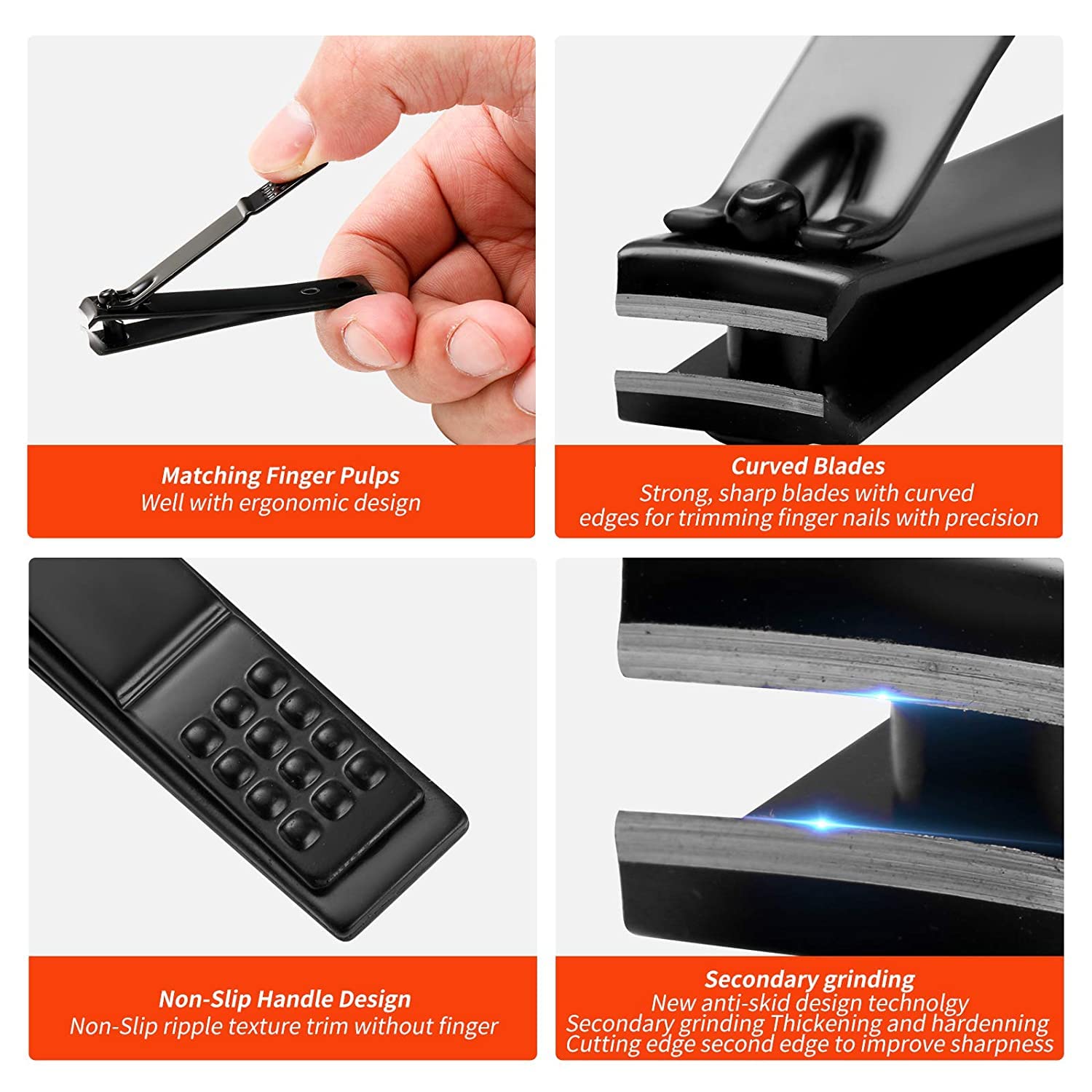 【2022 New Upgraded 7 in 1 Black Manicure Set】 Professional Manicure Kit Contains toenail and nail tools , the main functions are including hand care, foot care, Ear care, facial care. Includes toenails clipper, fingernails clipper, multi-purpose scissor, ear pick, eyebrow tweezer, nail file, nail cleaner.