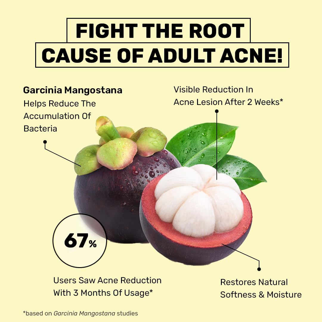 GARCINIA MANGOSTANA (MANGOSTEEN): It is an important antioxidant and antibacterial, especially against Propionibacterium acnes, the leading cause of adult acne development. Clinical studies have proven mangosteen as a super ingredient to treat acne lesions. It also reduces oxidative stress (the root cause of collagen fragmentation).