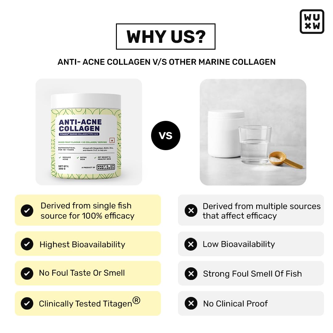 WHAT’S UP ANTI-ACNE COLLAGEN FOR SPOTLESS SKIN: Our Anti-acne collagen powder treats adult acne, giving you rejuvenated, clearer, and firmer skin while benefiting your hair and nails. Get rid of adult acne with our anti-acne collagen powder which helps your skin stay hydrated, brings firmness to the molecular structure, and prevents your skin from aging faster.