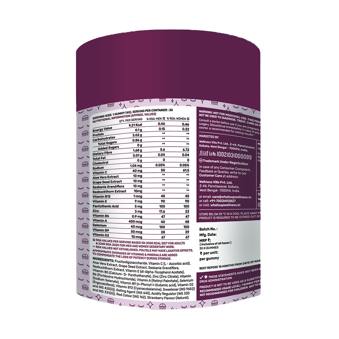 What’s Up Wellness Beauty No Added Sugar Gummies: It is a delicious blend of essential nutrients to keep your skin hydrated and maintain its youthful glow. Superfood Sea Buckthorn fights the daily pollution & prevents breakouts while Aloe Vera helps in softening & moisturizing the skin. Zinc prevents acne.