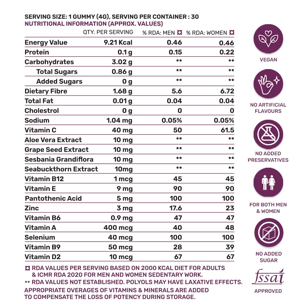 Expert Blend of Nutrition: These gummies are a combination of super nutrition which is just what you need for your skin, hair & nails to glow and grow and maintain their structure. Contains the goodness of Biotin, Sea Buckthorn, Aloe Vera, Folic Acid, Grape Seed Extract, Zinc & Vitamins A to E.