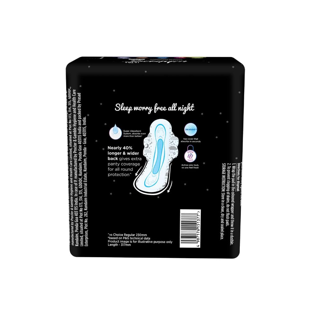 Whisper Bindazzz Nights ensures upto 0% leaks all night long. In order to manage night-time flow, these pads are nearly 40% longer and have a wider back so you are covered from leaks from all sides.