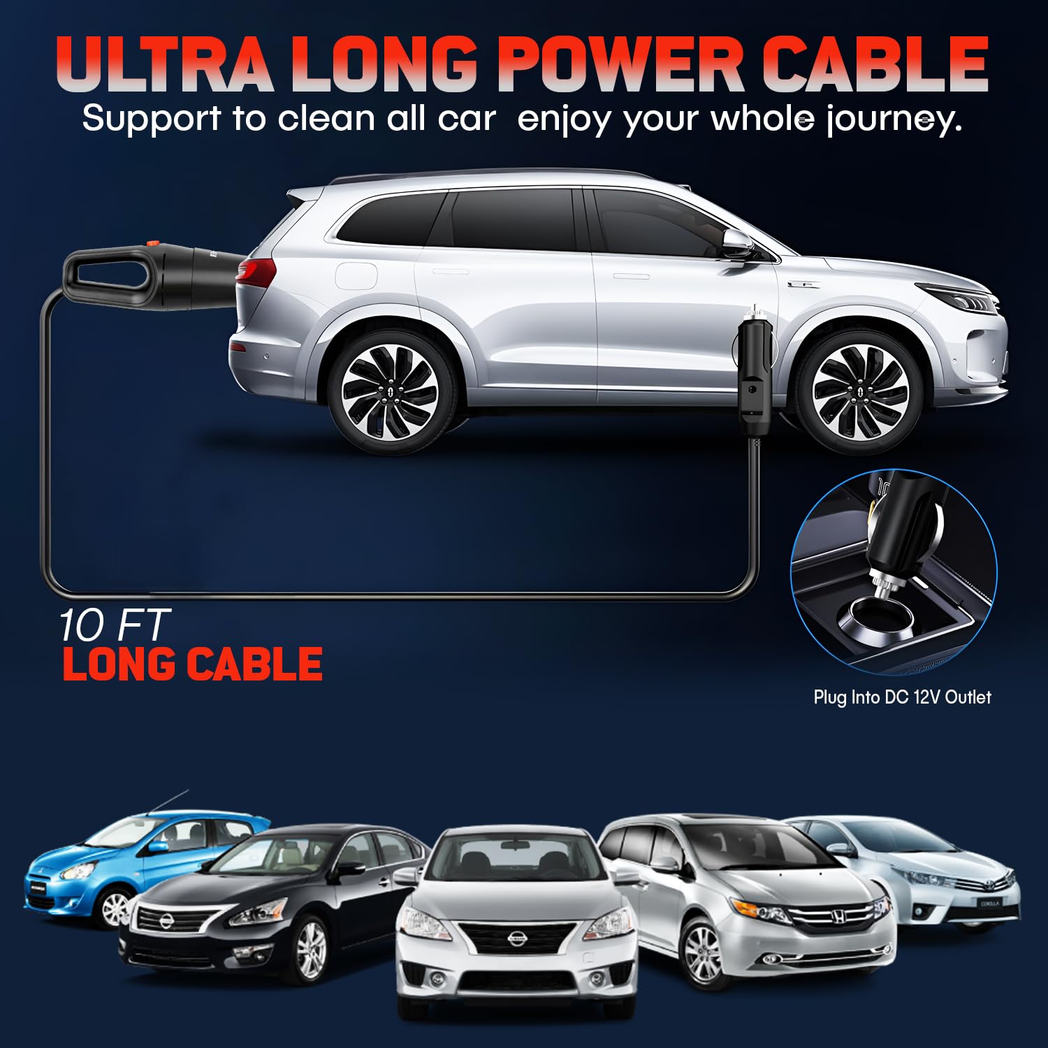 12ft Power Cord for Wide Reach: The vacuum cleaner for home and car use has 12ft cord provides ample reach to clean your entire car without constantly needing to unplug and relocate the vaccine cleaner for home and car.