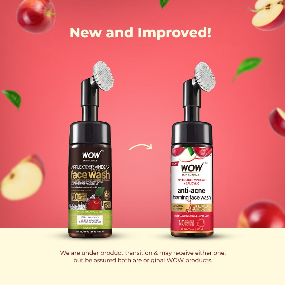 WOW Skin Science Organic Apple Cider Vinegar Face Wash equipped with the foaming face brush is specially formulated to lock your pores with intense cleansing and nourishment. It helps in purifying pores and diffuse the mulish impurities, leaves your skin clean, clear and radiant with every wash. The packaging includes in-built face brush that is well designed with gentle silicone bristle to give your face deep cleansing on surfaced and within enlarged pores. Helps your skin to fight against acne and blackheads. Gentle, cleansing and proactive anti-acne care for your skin with wow skin science apple cider vinegar foaming face wash! It is enriched with pure apple cider vinegar, aloe vera extract and vitamins b5 and e for cleansing, healing and hydrating care to get you clear, soft and supple skin. When massaged on damp skin, its rich foam dissolves and washes away the dead skin cells, dirt and pollutants from the surface of your skin and all the open pores. Apple cider vinegar contained helps balance the essential skin oils, tighten the open pores and lighten blemishes. The aloe vera extract soothes inflammations and gives an intensive hydration to your skin. Vitamin b5 and e can enhance the elasticity of your skin and its ability to retain moisture. All in all, your skin will feel so much clearer, softer and brighter. Key Ingredients: Purified Water, Sodium Cocoyl Isethionate, Sodium Lauroyl Sarcosinate, Disodium Cocoamphodiacetate, Decyl Glucoside, Cocamidopropyl Betaine, Glycerin (Vegetable Derived), Sodium Lactate, Sodium PCA, Apple Cider Vinegar, Aloe Vera Extract, D Panthenol (Pro-Vitamin B5), Tocopheryl Acetate (Vitamin E), Allantoin, Sodium Benzoate, Potassium Sorbate, Phenoxyethanol & Fragrance. HOW TO USE Splash some water on the face and neck. Pump out a little amount of the face wash apply all over your face and neck. Use the built-in brush in a circular motion on your face and neck to remove dirt. Move from the base of your neck to the jawline and then upwards to the cheeks, nose, and forehead. Massage for 2 minutes, and then rinse thoroughly with plain water. Use the face wash at night to keep your skin clear of dirt and pollution. Follow with a moisturizer.