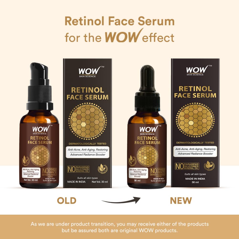 Repair and revive your aging and acne-prone skin with WOW Skin Science retinol face serum. The serum is infused with retinol (vitamin a), a natural exfoliator that improves skin cell turnover; witch hazel extract, rich in cell-repairing polyphenols; aloe vera leaf juice, a natural skin hydrator; jojoba oil, loaded with essential fatty acids and minerals; and vitamins B3 & e that nourish and restore skin. The serum helps to hydrate and repair skin, boost collagen and elastin, minimize fine lines, clear up acne flare-ups, reduce pore size, smoothen acne scars, clarify skin tone, refine skin texture, even out complexion, and boost radiance. Retinol helps to repair skin damage caused due to environmental exposure and supports skin renewal process. The serum has aloe vera leaf extract that supports skin hydration and helps in restoring skin’s moisture barrier. Witch hazel helps to clarify skin, tone pores and gives skin a smooth appearance. The serum helps in the skin renewal process and moisturization. It also supports the collagen structure of the skin which improves skin texture and appearance. Ideal for skin with fine lines, dullness, patchy skin tone; also for acne-prone skin. Avoid applying during the day, as sun exposure can lead to skin sensitivity and flaking. Always use a moisturizer over this serum. Results may vary depending on your skin condition.