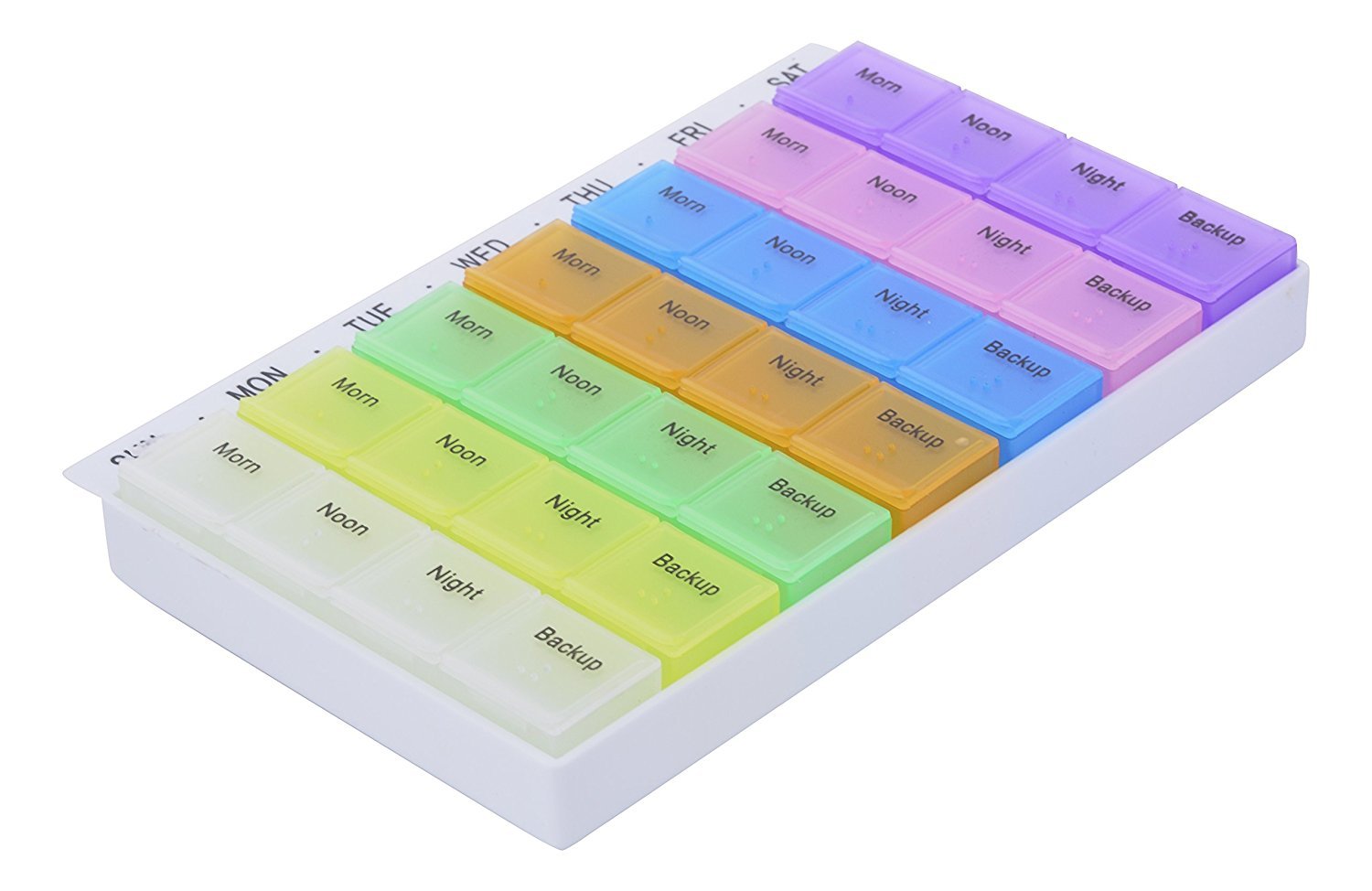 This pill organizer is great if your traveling or on-the-go since you can detach exactly the days you need. For the on-the-go people, pack your vitamins and anything else you need into this quilt-covered case. You can throw it into your bag and locate it quickly.7 Day Weekly 28 Compartments Pill Box Morning Night Medicine Pill Organizer Tablet Storage Container Case For Pills . Keep Pills secure and dosage regulated Useful for senior Citizens and Handicapped Person.