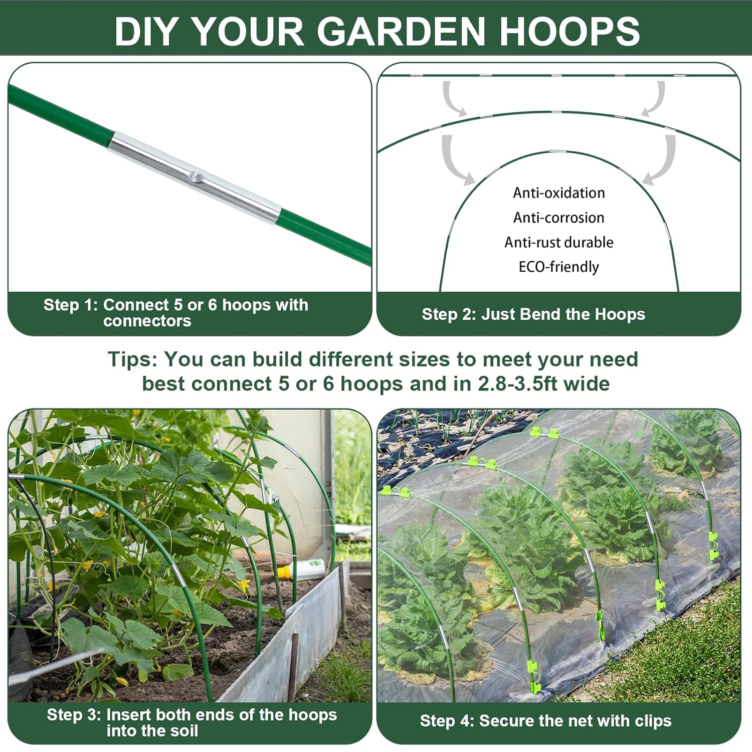 【Easy to Install and Store】① Insert the garden hoop into the soil. ②Connect 5 or 6 garden hoops together with connectors. ③Bend the greenhouse hoop and insert the other side into the soil. ④Put netting or covering on it and secure it with clips. Warm reminder: Please wear work gloves during installation to avoid accidental injuries.