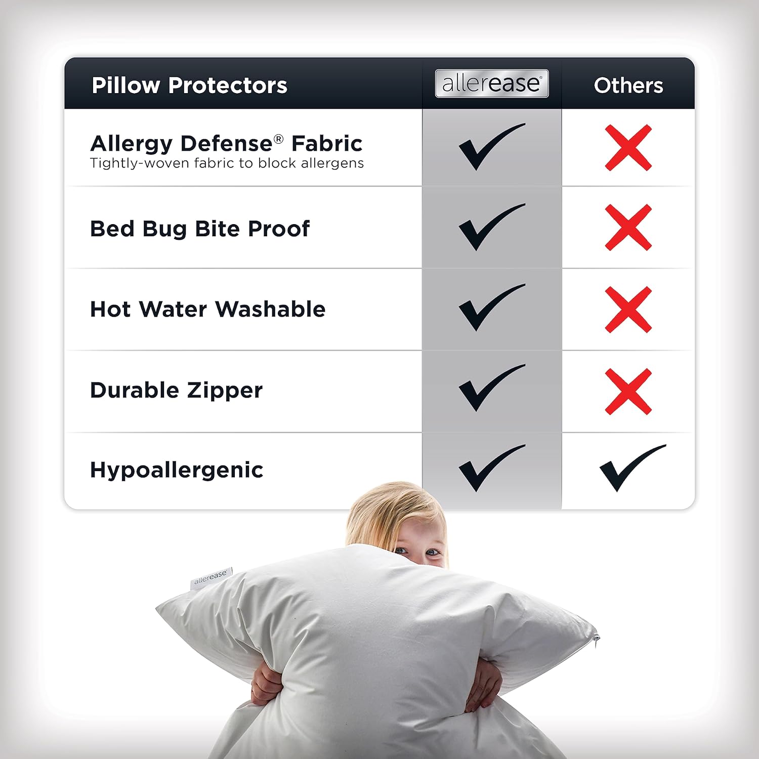 From the #1 selling allergy bedding brand, the AllerEase Platinum Pillow Protector delivers premium comfort and protection for a truly clean pillow. It features luxurious, plush knit temperature balancing fabric, that continuously adjusts to your body temperature to keep you comfortable throughout the night. Our expertly designed Allergy Defense Fabric prevents unhealthy household allergens from collecting in your pillow. It can be easily removed and washed in hot water to remove dirt and surface allergens. Product protection inhibits the growth of odor-causing particles, helping to keep your pillow protector fresher in-between washes. All AllerEase products come with our Lifetime Warranty, for peace of mind that you’ve made a clean, healthy choice for you and your family!